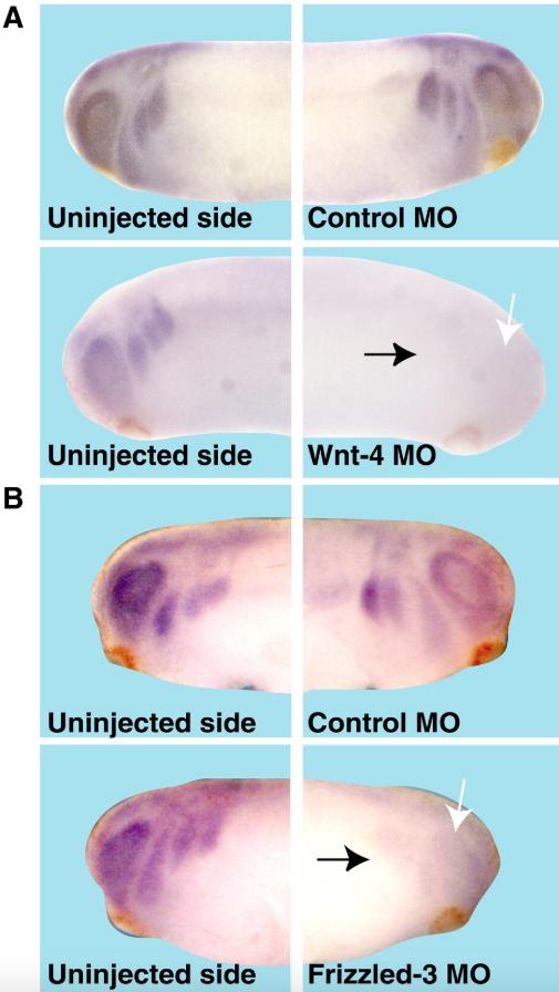 Fig. 2. Expression of pescadillo depends on Wnt-4 and Fz-3. Xenopus laevis embryos were unilaterally injected into one dorsal-animal blastomere at 8-cell stage with either antisense morpholino oligonucleotides (MO) against Wnt-4 (A), Frizzled-3 (B) or a control MO (A, B). Expression of pescadillo was visualized by whole-mount in situ hybridization. Expression of pescadillo in the eye (white arrows) and the cranial neural crest cells (black arrows) depends on Wnt-4 as well as Frizzled-3 function.