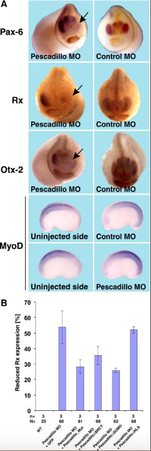 ???displayArticle.abstract??? Pescadillo is a multifunctional, nuclear protein involved in rRNA precursor processing, ribosomal assembly, and transcriptional regulation. Pescadillo has been assigned important functions in embryonic development and tumor formation. We previously identified pescadillo as a potential downstream target of non-canonical Wnt-4 signaling. Here we have investigated for the first time the function of the Xenopus laevis homolog of pescadillo during early embryogenesis on a molecular level. Loss of function analysis indicates that pescadillo is required for eye development and neural crest migration. BrdU incorporation and TUNEL assays indicate that a loss of pescadillo function affects proliferation and triggers apoptosis through a p53-mediated mechanism. Furthermore, pescadillo affects the expression of early eye-specific marker genes, likely independent of its function in regulating proliferation and apoptosis, and in addition migration of cranial neural crest cells. Our data indicate that pescadillo has multiple important functions during X. laevis development and that its function is highly conserved among different species.
