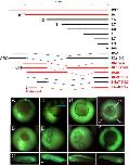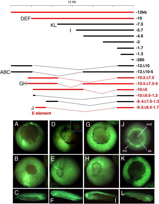 Fig. 2. Transgenic expression of deletion constructs. Top: Diagrams of a series of 5â² and internal deletion fragments fused to GFP, as in Fig. 1. The endodermal element is marked and fragments giving vegetal expression in the early gastrula are colored red. Below is GFP expression in various transgenics, with the corresponding expression panels indicated on the left of the constructs. (A, D, G, J, K) are stage 10.5; (B, E, H) are stage 12; (C, F, I, L) are tailbud stages. (AâC) Construct â 12δ10-5 is negative in early endoderm. (DâF) Positive construct â 10; the embryo in (D) is a hemi-transgenic, providing a good control for the background fluorescence; the insert panel is the animal pole at the same exposure. (GâH) Positive construct â 10.5δ7.7-5. (I) Construct â 5.7 is positive in the later foregut, as well as in the axis, like other 5â² constructs; (J) â 9.5δ8.4-1.7 is positive in the involuting and non-involuting endoderm, whereas â 7.5 is not (K), but it gives low-level expression in the posteriorendoderm of the tailbud (L). In panel J, the main tissues of the early gastrula are marked: end, endoderm; ect, ectoderm; ee, the extra-blastoporal endoderm, which involutes over the blastopore.