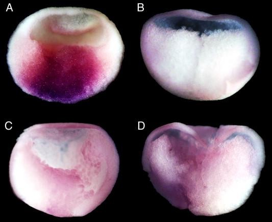 Fig. 2. Spatial distribution of Vg1 and SPCs in whole-mount hemisected stage 9 Xenopus blastulae. (A) Vg1, (B) Furin, (C) SPC4, (D) SPC6. Embryos are not oriented specifically.