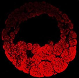 gdf1 (growth differentiation factor 1) expression visualized by immunohistochemistry, in a bisected Xenopus laevis embryo, NF stage 9, dorsal left.