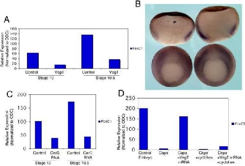 Figure 1. FoxC1 is an indirect target of VegT and FoxC1 expression in the equatorial zone. A: VegT-depleted gastrulae (early gastrula, stage 10; mid gastrula, stage 10.5) showed a decrease of FoxC1 expression using real time RT-PCR compared to control sibling embryos. Levels of expression are normalized to ornithine decarboxylase (ODC).B: Using whole-mount in situ hybridization, FoxC1 was shown to be localized in the equatorial zone of wild-type embryos at the mid-gastrula stage (stage 11). The upper two half-embryos seen in hemisection through the blastopore; lower two whole embryos, viewing the blastopore. C: After CerS mRNA injection at the 2-cell stage, FoxC1 expression measured by real time RT-PCR is reduced in wild type gastrulae, at the early and mid-gastrula stage. D: The expression of FoxC1 in 1 whole embryo compared to batches of 10 wild type animal caps (Caps), 10 caps injected with 60 pg VegT mRNA at the two cell stage (Caps + VegT mRNA), 10 wild type caps treated with cycloheximide (Caps + cyclohex), and 10 caps injected with VegT mRNA and treated with cycloheximide (Caps + VegT + cyclohex). Wild-type animal caps do not express FoxC1, while injection with VegT mRNA induces FoxC1 expression. Injection of cycloheximide in addition to VegT mRNA into animal caps represses FoxC1 expression.