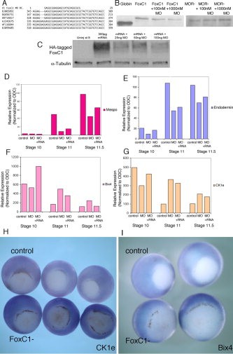 Figure 2. The phenotype of FoxC1 depleted gastulae. A:Xenopus FoxC1 pseudoalleles aligned against the reverse complement of the morpholino oligo used in the study using Clustal alignment in Macvector. B: FoxC1 MO (MO) blocks translation of FoxC1 mRNA (FoxC1) in a dose-responsive fashion, but does not block translation of a protected FoxC1 RNA, (MOR-), in an in vitro translation assay. C: HA-tagged Fox1 mRNA was injected alone or together with different doses of FoxC1 MO at the 2-cell stage to confirm a reduction of FoxC1 translation. DâG: Wild type sibling embryos and embryos injected with 40 ng MO (MO), or 40 ng MO and 50 pg MO-R FoxC1 mRNA (MO+RNA) were cultured until early (stage 10), mid (stage 11), and late gastrula (stage 11.5) stages before freezing and analyzing by real time RT-PCR for the expression of Mespo (D), Endodermin (E), Bix4 (F), and CK1ϵ (G). Expression levels are normalized to ODC. H,I: Whole mount in situ hybridization on FoxC1-depleted mid-gastrulae (bottom) as compared to wild type sibling embryos (top) showing increased expression of CK1ϵ (H) and Bix4 (I) after FoxC1 depletion.