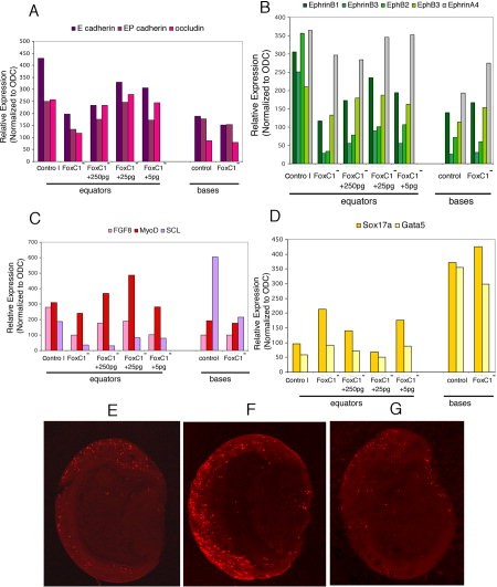 Figure 5. FoxC1 target genes and apoptosis at the early tailbud stage (stage 20) (AâD). Real-time RT-PCR analysis of the equatorial zones (equators) and vegetal masses (bases) shown in Figure 3 (F and I) for E and EP cadherin and occludin (A); Ephrin B1 and 3, EphB2 and 3, and Ephrin A4 (B); FGF8, MyoD, and SCL (C); and Sox17 and GATA5 (D). Expression was normalized to ODC. EâG: Oocyte-derived, FoxC1-depleted embryos were hemisected in the sagittal plane and subject to TUNEL staining at stage 20. FoxC1-depleted embryos exhibited more cell apoptosis particularly in the mesoderm (F) compared to controls (E), and this effect was rescued by reintroducing MO-R FoxC1 mRNA (G).