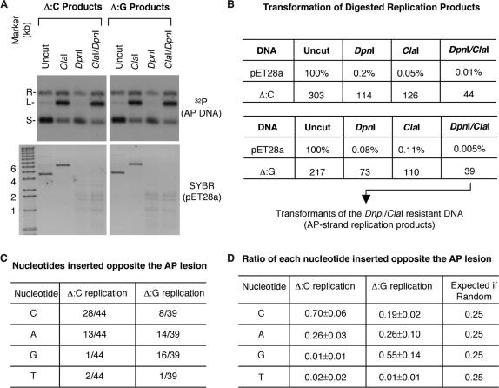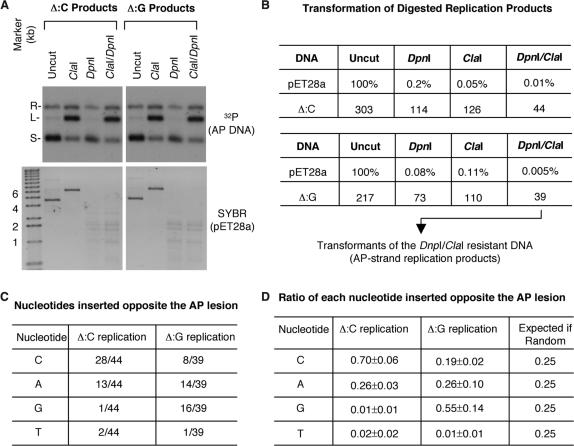 Figure 5. Determination of the nucleotides opposite the AP site in the final replication products (after 75 min of incubation in NPE). (A) Restriction digestion of the gel-purified supercoiled final replication products (detected by 32P) and the control pET28a DNA (detected by SYBR Gold). R: relaxed; L: linear; S: supercoiled. (B) Transformation efficiency of pET28a (kanR; expressed in percentages of the number of transformants of the uncut DNA) and AP DNA (ampR; expressed in absolute colony numbers). (C) The nucleotides found at the position opposite the AP lesion in the plasmids isolated from the transformants of the DpnI and ClaI-digested Δ:C and Δ:G replication products. (D) The average ratios and absolute deviations of each nucleotide inserted at the position opposite the AP lesion for the Δ:C and Δ:G replication products. The data were from two independent experiments for each substrate. The right-most column listed the expected ratios if the AP lesion was replicated by random insertion of the 4 nt.