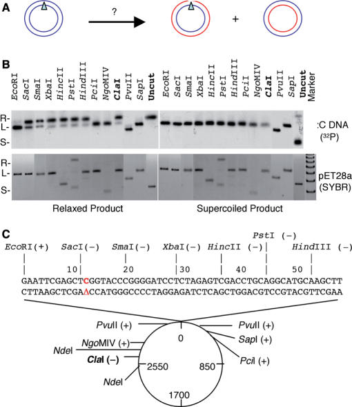 Figure 2. Restriction enzyme mapping of the replication intermediate. (A) Probable products of the lesion-carrying strand and lesion-free strand after replication. (B) The relaxed and supercoiled products of the 20 min time point were gel-purified, digested with the indicated restriction enzymes and separated on 1% agarose gels. The gels were stained with SYBR Gold to detect the control DNA pET28a and then dried for exposure to Phosphoimager to detect the 32P signal of the replication products. pET28a lacks a PstI site, but the enzyme caused some nicking to the DNA. PvuII cuts Δ:C at 2 sites. HincII and NgoM1V cut pET28a at 2 and 4 sites, respectively. (C) Plot of the restriction digestion pattern of the relaxed product. (+): cut; (−) uncut.