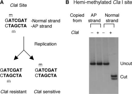 Figure 3. Effect of ClaI hemi-methylation. (A) The predicted methylation pattern of the ClaI site in Δ:C after one round of replication. (B) ClaI digestion of the two hemi-methylated, ClaI-containing NdeI fragments copied from Δ:C.