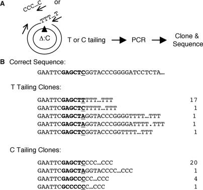 Figure 4. Determination of the stalling sites of DNA replication. (A) Experimental strategy to clone the stalled intermediates. The arrows illustrate the primers used for PCR. The templates for tailing and PCR were the gel-purified relaxed DNA from the 20 min time point. (B) Sequencing data of the PCR products showing the position of stalling.