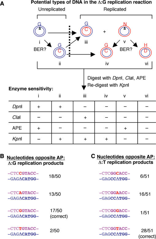 Figure 6. Analysis of the replication products that still carried the AP lesion (after 75 min of incubation in NPE). (A) Six potential types of DNA and their sensitivity to various enzymes. The lesion-carrying DNA would be nicked on the AP strand but intact on the complementary strand. BER: base excision repair; H: non-G; D: non-C. (B) Sequence analysis of the cloned PCR products amplified from Δ:G replication products that had been digested with DpnI, ClaI, APE and KpnI. (C) Sequence analysis of the cloned PCR products amplified from Δ:T replication products that had been digested with DpnI, ClaI, APE and KpnI.