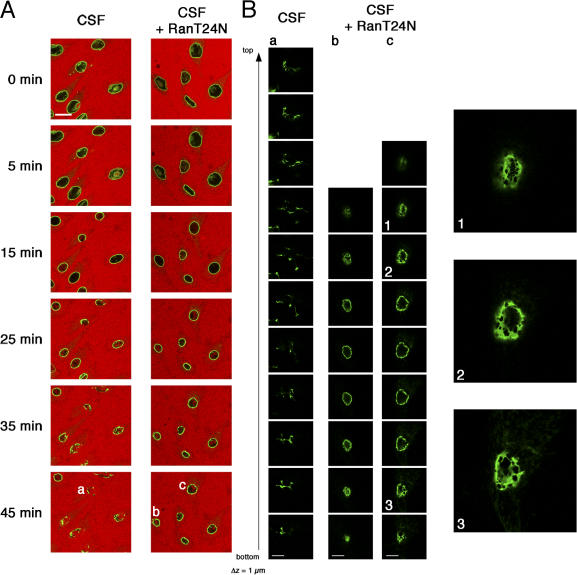 During prophase, vertebrate cells disassemble their nuclear envelope (NE) in the process of NE breakdown (NEBD). We have established an in vitro assay that uses mitotic Xenopus laevis egg extracts and semipermeabilized somatic cells bearing a green fluorescent protein-tagged NE marker to study the molecular requirements underlying the dynamic changes of the NE during NEBD by live microscopy. We applied our in vitro system to analyze the role of the Ran guanosine triphosphatase (GTPase) system in NEBD. Our study shows that high levels of RanGTP affect the dynamics of late steps of NEBD in vitro. Also, inhibition of RanGTP production by RanT24N blocks the dynamic rupture of nuclei, suggesting that the local generation of RanGTP around chromatin may serve as a spatial cue in NEBD. Furthermore, the microtubule-depolymerizing drug nocodazole interferes with late steps of nuclear disassembly in vitro. High resolution live cell imaging reveals that microtubules are involved in the completion of NEBD in vivo by facilitating the efficient removal of membranes from chromatin.