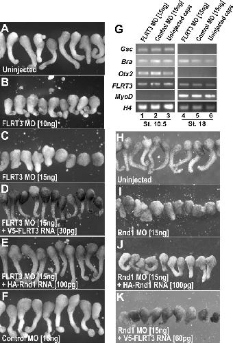 Figure 4. Loss of FLRT3 blocks activin-mediated animal cap elongation. (AâF) Animal cap explants isolated from embryos injected with FLRT3 MO fail to extend properly (B,C) after activin treatment (5 ng/mL), while animal caps both from uninjected (A) and control MO-injected (F) embryos elongate. The FLRT3 MO effect was rescued by coinjection of FLRT3 rescue mRNA lacking the MO annealing sequences (D) or by coinjection of HA-Rnd1 mRNA (E). (G) RTâPCR analysis of RNAs isolated from activin-treated animal caps that have been injected with control or FLRT3 MOs. RNAs are from animal cap explants equivalent to stage 10.5 and stage 18 embryos. (HâK) Rnd1 MO also blocks activin-mediated animal cap elongation. (J) Coinjection of HA-Rnd1 mRNA rescues the Rnd1 MO phenotype. (K) V5-FLRT3 mRNA was unable to rescue.