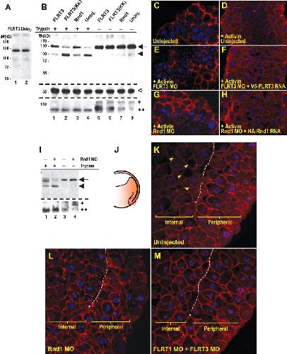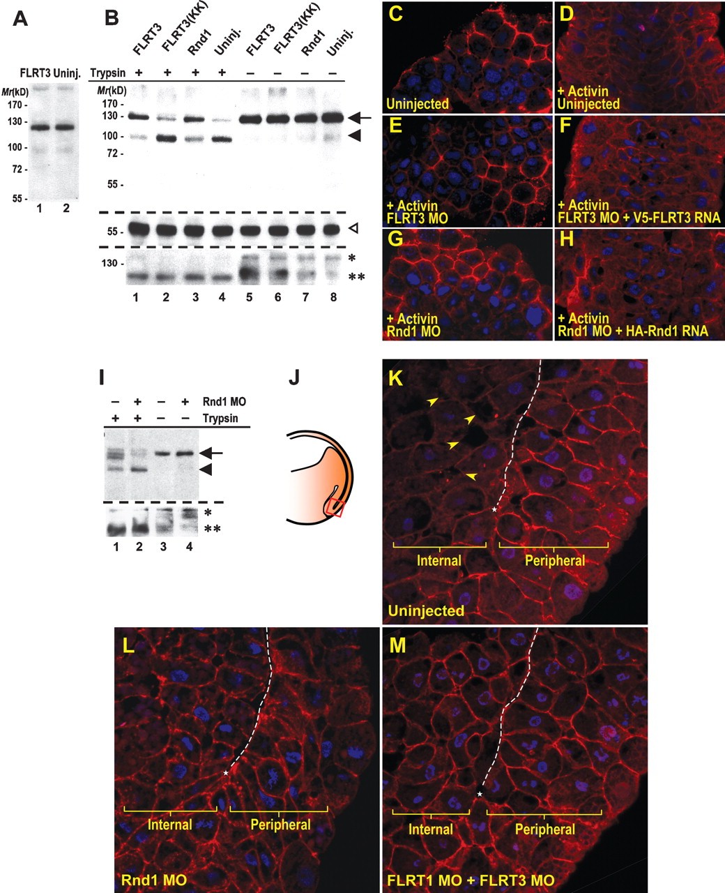 Figure 6. Expression of FLRT3 and Rnd1 promotes cadherin internalization. (A) C-cadherin expression in FLRT3-expressing cells. Western blot analysis was performed using extracts obtained from uninjected and FLRT3 mRNA-injected animal cap cells. (B) Expression of C-cadherin in animal cap explants before and after trypsin treatment. An arrow indicates native C-cadherin protein, a closed arrowhead indicates processed C-cadherin, and an open arrowhead indicates β-tubulin. The full-length integrin-β1 protein is indicated with a single asterisk (*), while the processed integrin-β1 is indicated with double asterisks (**). (CâH) Immunofluorescent staining of C-cadherin in activin-treated or untreated animal cap explants. C-cadherin (in red) is predominantly localized at the cell membrane, while the explants treated with activin show an increase of cytoplasmic cadherin (shown in C,D). (E,G) Inhibition of FLRT3 or Rnd1 expression blocks the internalization of C-cadherin even after an activin treatment. (F,H) Overexpression of FLRT3 or Rnd1 reverts the localization of C-cadherin to the cytoplasm. DAPI staining is in blue. (I) Expression of C-cadherin in deep cells of the dorsal marginal zone before and after a trypsin treatment. An arrow indicates native C-cadherin protein, and a closed arrowhead indicates processed C-cadherin. (J) Schematic diagram of a mid-gastrula-stage embryo. A boxed area in red represents the magnified regions in KâM. (KâM) Subcellular localization of C-cadherin in the organizer of a wild-type, a Rnd1 MO-injected (10 ng per embryo), and a FLRT1/3 MO-injected (30 ng each per embryo) gastrula-stage embryo (stage 11). (K) In the wild-type embryo, C-cadherin staining is predominantly on the cell surface of peripheral cells, but not in the internal cells. The boundary between the peripheral layer and the internal layer is indicated with a dotted line, and the tip of the cleft is marked with an asterisk (*). Arrowheads indicate interstitial spaces between cells.
