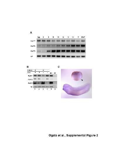 A, RT-PCR analysis showing temporal expression patterns of FLRT1, FLRT2 and FLRT3. B, RT-PCR analysis showing that FLRT3 is a direct activin target, but FLRT1 and 2 are not. Cycle numbers are 30 cycles for FLRT1, 31 cycles for FLRT2, and 28 cycles for FLRT3. C, Whole mount in situ hybridization analysis of FLRT1 expression in stage 10.5 gastrula stage and stage 20 tailbud stage embryos. FLRT1 is expresses weakly in animal cap ectoderm of the gastrula stage embryos, and later expressed in the dorsal half of the cement gland. Arrowhead: dorsal lip.