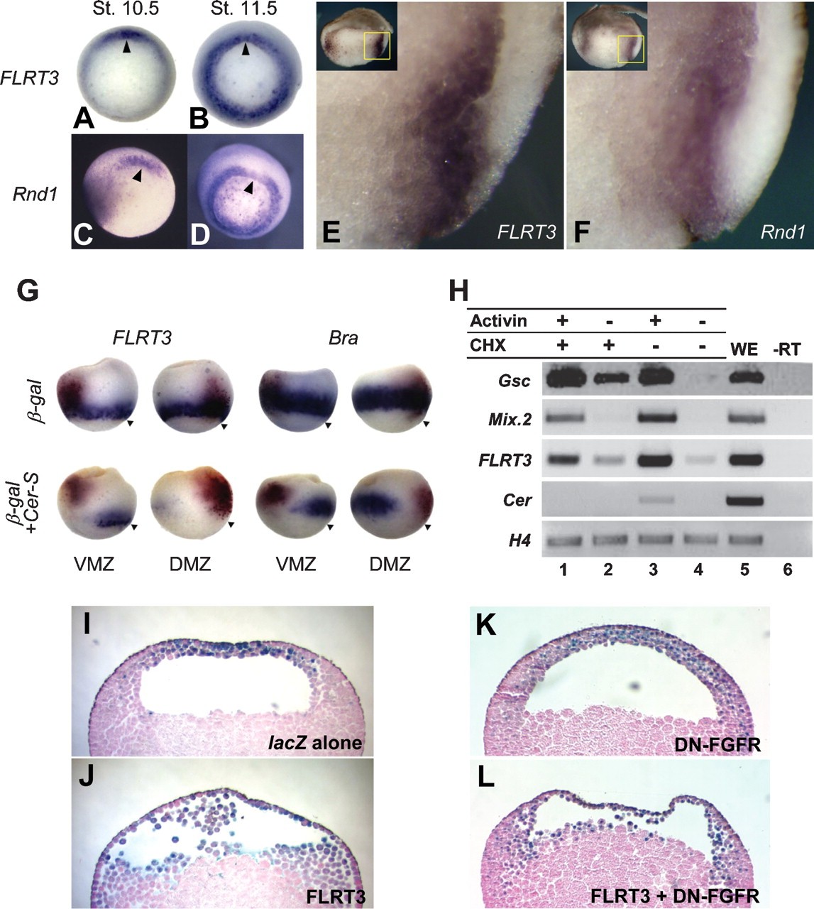 Figure 1. FLRT3 is a direct target of activin and regulates cell adhesion. (AâF) In situ hybridization of FLRT3 (A,B,E) and Rnd1 (C,D,F) in Xenopus gastrula, vegetal view (AâD), and cross-section bisecting Spemannâs organizer (EâF). Arrowheads mark the dorsal lip of the blastopore. (G) Overexpression of Cer-S together with β-galactosiade mRNA at the ventral marginal zone (VMZ) or dorsal marginal zone (DMZ) blocks FLRT3 and brachyury (Bra) expression in the gastrula-stage embryos. Arrowheads indicate the dorsal blastopore lips and brown corresponds to β-galactosidase expression. (H) RTâPCR analysis of animal cap explants. (CHX) Cycloheximide; (H4) histone H4; (WE) whole embryos. (I,J) FLRT3-expressing cells (0.3 ng per embryo) detach from the blastocoel roof and fall into the cavity. (K,L) Coexpression of a dominant-negative form of FGF receptor (2 μg of DN-FGFR mRNA) does not affect the cell detachment property conferred by FLRT3.