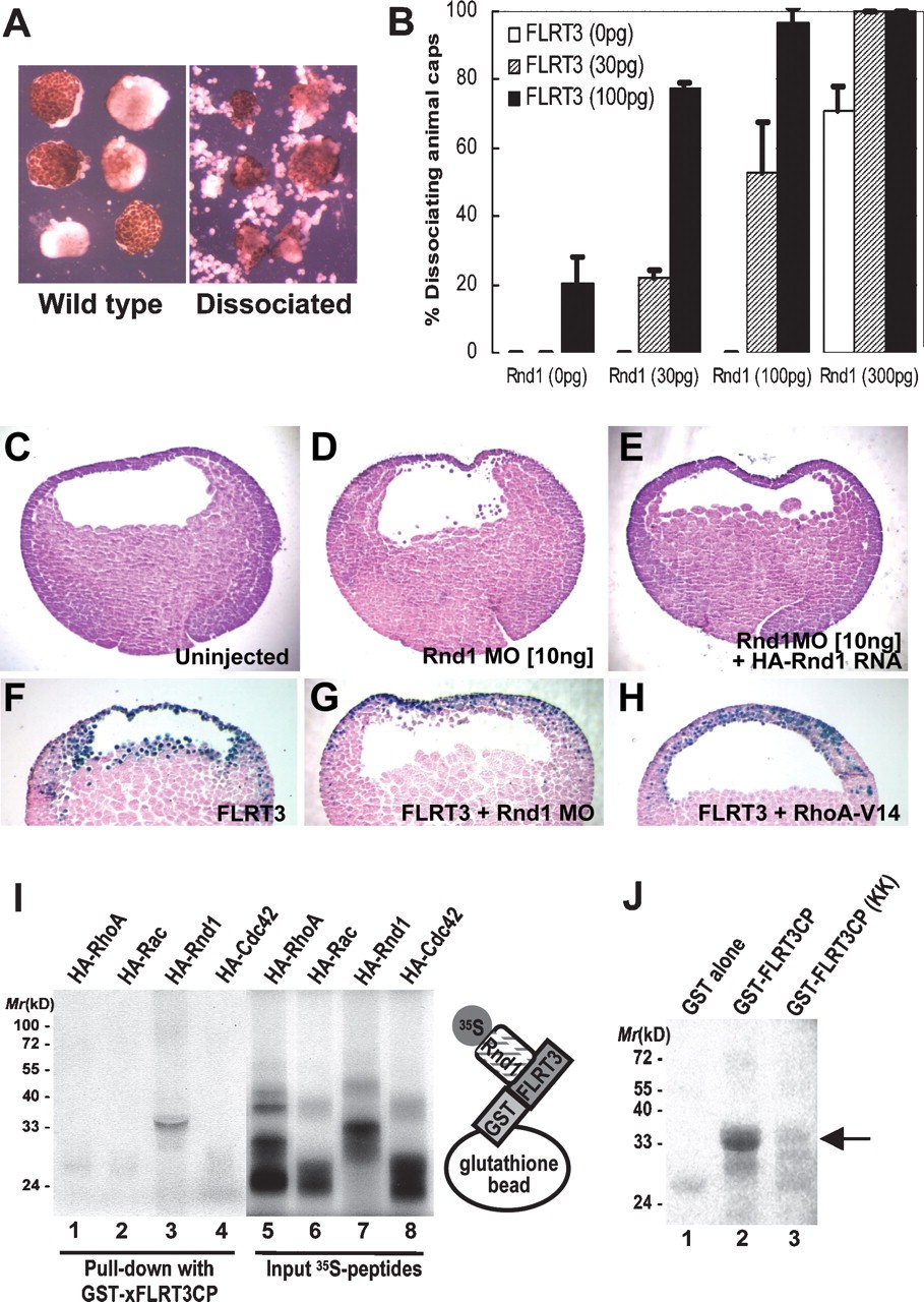 Figure 2. FLRT3 interacts directly with Rnd1 and affects cell adhesion. (A) Overexpression of FLRT3 promotes cell detachment in animal caps. (B) Coinjection of FLRT3 and Rnd1 synergistically increases the percentage of the detached cells. (CâE) Injection of Rnd1 MO (10 ng per embryo) in the equatorial region of four-cell stage embryos disrupts gastrulation movement. (E) Coinjection of HA-xRnd1 (1 ng) RNA rescues this phenotype. (F,G) Cross-section of a stage 9 embryo showing that coinjection of Rnd1 MO partially rescues the loss of cell adhesion conferred by the overexpression of FLRT3. (H) A constitutively active form of xRhoA (xRhoA-V14, 3 pg per embryo) rescues the cell detachment phenotype. (I) Rnd1 directly interacts with FLRT3 in vitro. (Lane 3) FLRT3-GST pulldown assay shows that only Rnd1 interacts with FLRT3. (J) Deletion of Lys580 and Lys581 (FLRT3CP-KK) significantly weakens interaction with 35S-labeled Rnd1 (arrow). Each experiment was repeated three times and reproducible results were obtained.