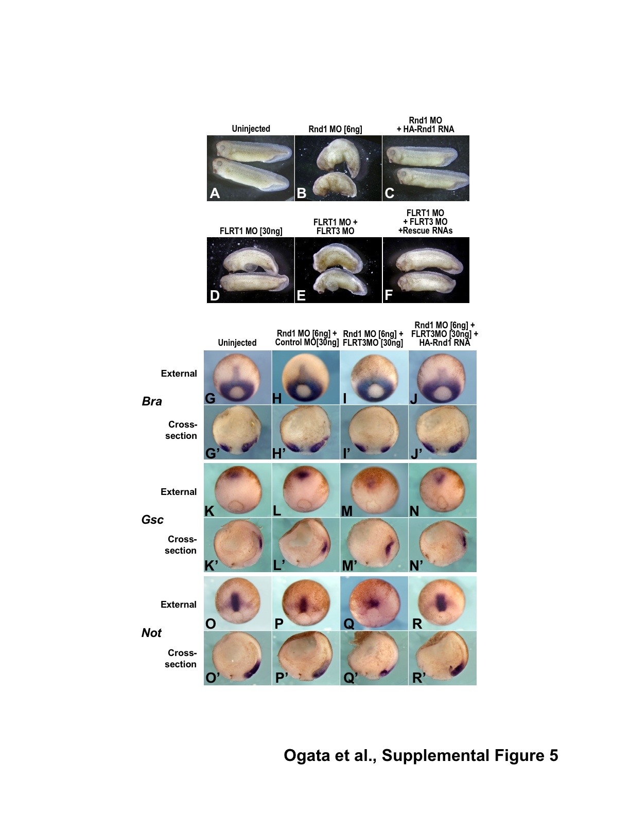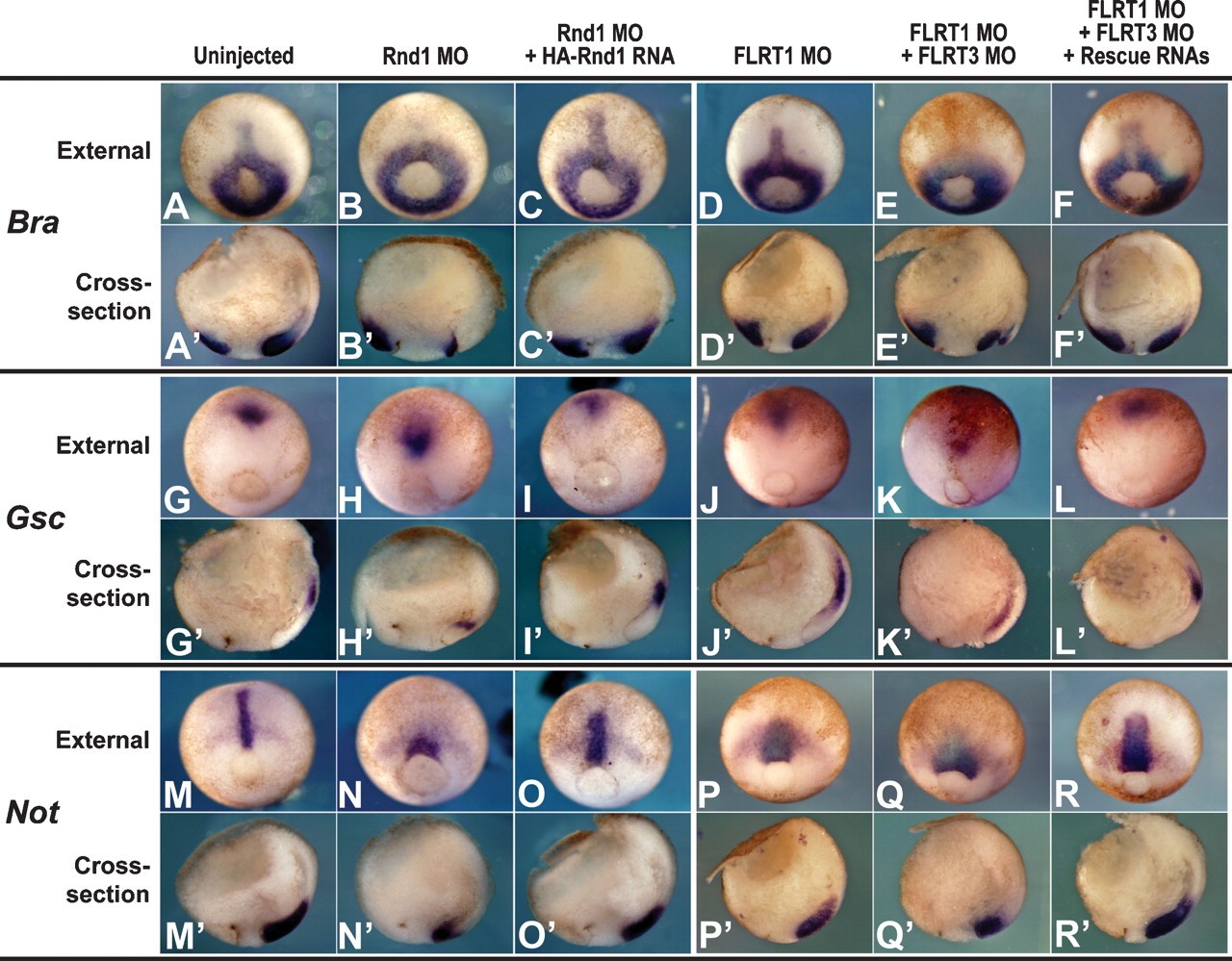 Figure 3. Rnd1 and FLRT1/3 loss-of-function phenotypes. In situ hybridization of Bra (AâF), gsc (GâL), and Xnot (MâR) in Xenopus mid-gastrula-stage embryos. AâR are dorsal external views, and Aâ²âRâ² are cross-sections bisecting through Spemannâs organizer. Note the lack of notochord extension in the mid-line of Rnd1-injected (12 ng) and FLRT1/3 MO-injected (30 ng each) embryos.