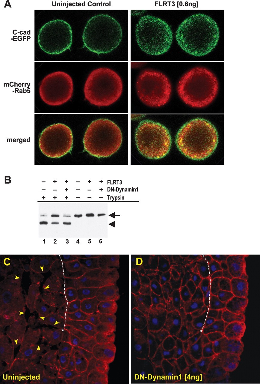 Figure 7. C-cadherin internalization is mediated by endocytosis. (A) Colocalization of C-cadherin and Rab5. mRNAs encoding GFP-tagged C-cadherin (1 ng per embryo) and mCherry-tagged Rab5 (1 ng per embryo) were injected animally into two-cell stage embryos with or without FLRT3 mRNA (0.6 ng per embryo). Animal cap cells were dissociated at the early gastrula stage and subjected to confocal immunofluorescent microscopy. (B) Animal cap cells overexpressing FLRT3 promote cadherin internalization and dominant-negative dynamin blocks the internalization. An arrow represents native C-cadherin protein, and a closed arrowhead represents processed C-cadherin. (C) Subcellular localization of C-cadherin in control uninjected embryo. Arrowheads indicate interstitial spaces between cells. (D) Overexpression of dominant-negative dynamin in the dorsal marginal region blocks cadherin internalization.