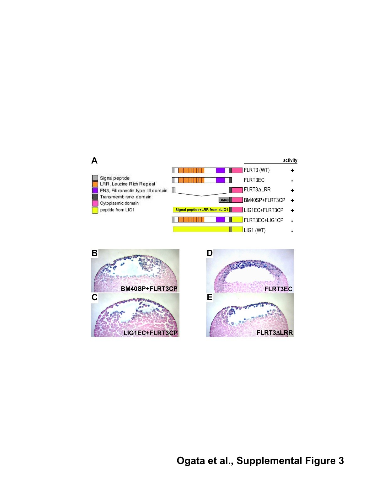 A, Various domains of FLRT3 are deleted to generate the indicated constructs. The extracellular domain including the signal peptide of FLRT3 is replaced with BM40 signal peptide. Lucine-rich domains and cytoplasmic domains of FLRT3 and LIG1 are exchanged to generate various chimera constructs. B-E, Overexpression effects of various deletion and chimera constructs. BM40SP-FLRT3CP (panel B) and LIG1EC-FLRT3CP (panel C) RNA causes cell detachment at the animal cap ectoderm. Overexpression of FLRT3EC (panel D) lacking the cytoplasmic domain does not cause cell detachment, but FLRT3ΔLRR (panel E), lacking most of the extracellular domain, causes the cell detachment.