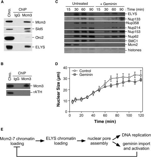 Figure 4. ELYS Interacts with the Replication Licensing System(A) Sperm chromatin was incubated in egg extract for 45 min. Chromatin was then isolated by centrifugation through a sucrose cushion, digested with nuclease, and immunoprecipitated with either nonimmune IgG or Mcm3 antibodies. Precipitated proteins were immunoblotted with antibodies to Mcm3, Sld5, Orc2, or ELYS. An equal sample of chromatin is shown as control for protein recovery.(B) Chromatin isolated from rATH-treated egg extract was digested with nuclease and immunoprecipiated with either nonimmune IgG or Mcm3 antibodies as in (A). Precipitated proteins were identified with antibodies to Mcm3 and rATH.(C) Sperm chromatin was incubated in egg extract treated with buffer alone or 50 nM gemininDEL. At the indicated times, chromatin was isolated and immunoblotted for ELYS, Nups133, 358, 214, 153, 62, SMC1, and Mcm2.(D) Sperm chromatin was incubated in egg extract treated with buffer alone or gemininDEL. At the indicated times, the size of randomly selected nuclei were measured. Values are shown ± the standard deviation.(E) Model for the interaction of ELYS with the replication licensing system.