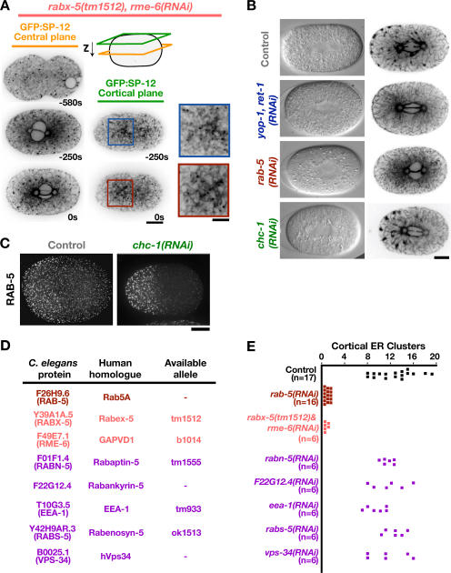 The endoplasmic reticulum (ER) is a contiguous network of interconnected membrane sheets and tubules. The ER is differentiated into distinct domains, including the peripheral ER and nuclear envelope. Inhibition of two ER proteins, Rtn4a and DP1/NogoA, was previously shown to inhibit the formation of ER tubules in vitro. We show that the formation of ER tubules in vitro also requires a Rab family GTPase. Characterization of the 29 Caenorhabditis elegans Rab GTPases reveals that depletion of RAB-5 phenocopies the defects in peripheral ER structure that result from depletion of RET-1 and YOP-1, the C. elegans homologues of Rtn4a and DP1/NogoA. Perturbation of endocytosis by other means did not affect ER structure; the role of RAB-5 in ER morphology is thus independent of its well-studied requirement for endocytosis. RAB-5 and YOP-1/RET-1 also control the kinetics of nuclear envelope disassembly, which suggests an important role for the morphology of the peripheral ER in this process.