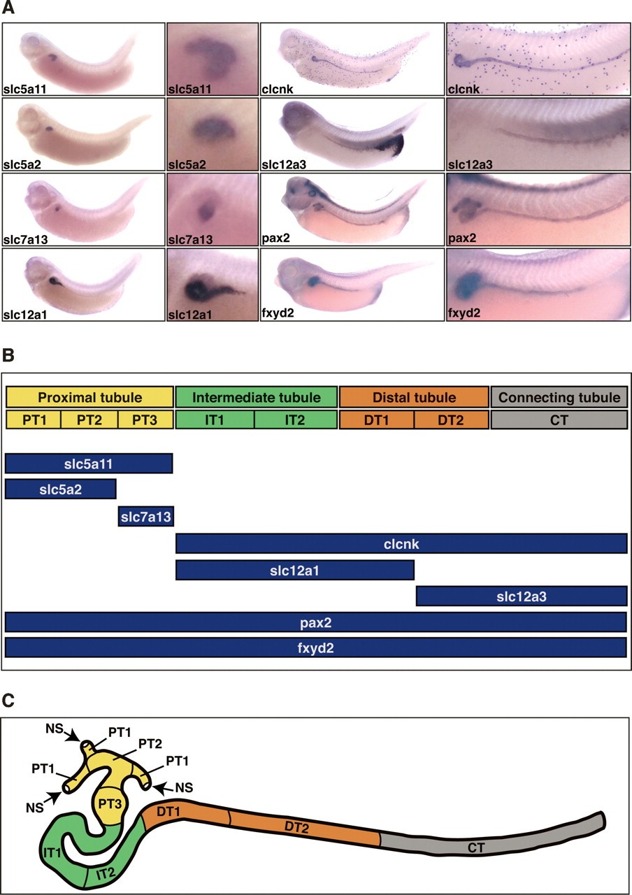 Figure 1. Segmental organization of the Xenopus pronephric nephron. (A) Spatial expression patterns of selected pronephric marker genes. Xenopus embryos (stage 35/36) were stained by whole-mount in situ hybridization for expression of clcnk (ClC-K), fxyd2 (Na, K-ATPase γ subunit), pax2, slc5a2 (SGLT2), slc5a11 (SGLT1L), slc7a13, slc12a1 (NKCC2), and slc12a3 (NCC). Lateral views are shown with accompanying enlargements of the pronephric kidney region. (B) Summary of marker gene expression along the proximodistal axis of the pronephric nephron. The localization of the expression domains is shown below the corresponding segments. (C) Schematic representation of the tubular portion of the Xenopus pronephric kidney. A stage 35/36 pronephric kidney is shown with the four tubular compartments color-coded. Each tubule may be further subdivided into distinct segments: proximal tubule (yellow; PT1, PT2, PT3), intermediate tubule (green; IT1, IT2, IT3), distal tubule (orange; DT1, DT2), and connecting tubule (gray; CT). The nephrostomes (NS) are ciliated peritoneal funnels that connect the coelomic cavity to the nephron. |