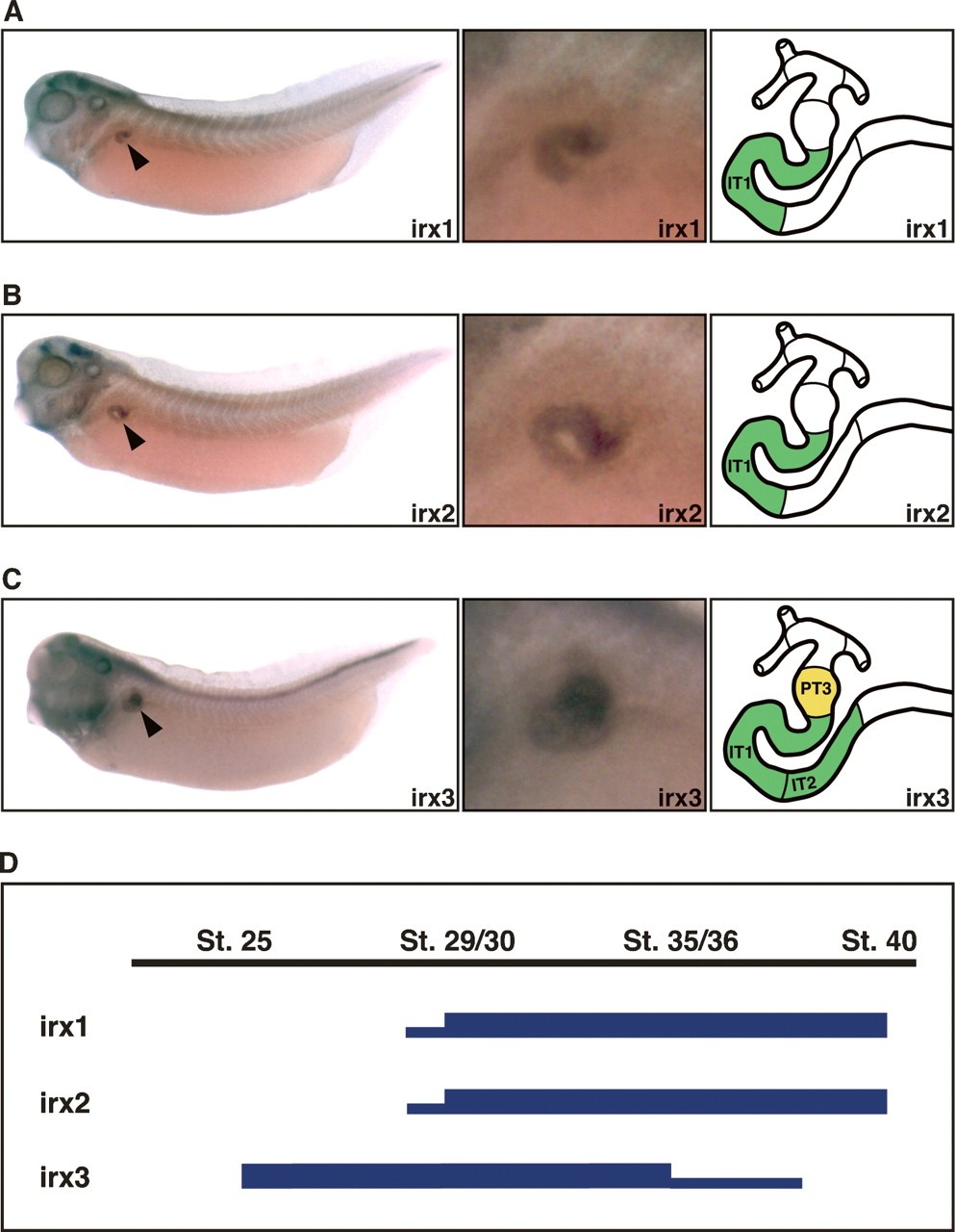 Figure 2. Expression of irx genes is highly regionalized in the developing pronephric kidney. (AâC) Expression patterns of irx1 (A), irx2 (B), and irx3 (C) in the pronephric kidneys of stage 35/36 Xenopus embryos as determined by whole-mount in situ hybridization. Lateral views of whole embryos (left panels; arrowheads indicate pronephric expression), enlargements of the pronephric region (middle panels), and color-coded schematic representations of the segment-restricted expression domains (right panels) are shown. Note the sharp boundaries that limit the expression domains of irx genes in the developing nephron. (D) Summary of the temporal expression profiles of irx genes during pronephric kidney development. The embryonic stages of X. laevis development are indicated. High and low levels of irx gene expression are illustrated with thick and thin lines, respectively. The embryonic expression patterns in early embryos are shown in Supplementary Figure 1. |