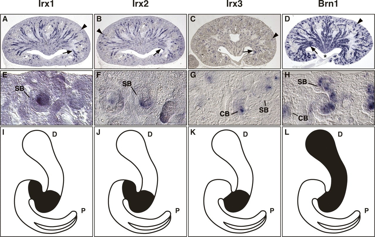 Figure 3. Irx gene expression marks an intermediate region of the S-shaped body. In situ hybridizations were performed on paraffin sections of E18.5 kidneys. Whole sagittal sections (AâD) and magnifications (EâH) of the renal cortex are shown to illustrate gene expression in developing nephrons. (IâL) The corresponding gene expression domains in the S-shaped body are indicated in the schematic drawings. (AâC) Irx1 and Irx2 are expressed in newly forming nephrons in the cortex (arrows) and the developing intermediate tubule epithelia (arrowheads). Irx3 expression is similar to Irx1 and Irx2, but fainter and more restricted. (D) Brn1 expression in the newly forming nephrons (arrowhead) and developing distal tubule epithelia (arrow). Note that in contrast to Irx genes, Brn1 is also highly expressed in epithelia of the renal papilla (asterisk). (IâK) Irx transcripts are confined to intermediate regions of S-shaped bodies. (L) Brn1 transcripts are detected in intermediate and distal domains of the S-shaped body. (CB) Comma-shaped body; (SB) S-shaped body; (P) proximal pole of the nephron; (D) distal pole of the nephron. |
