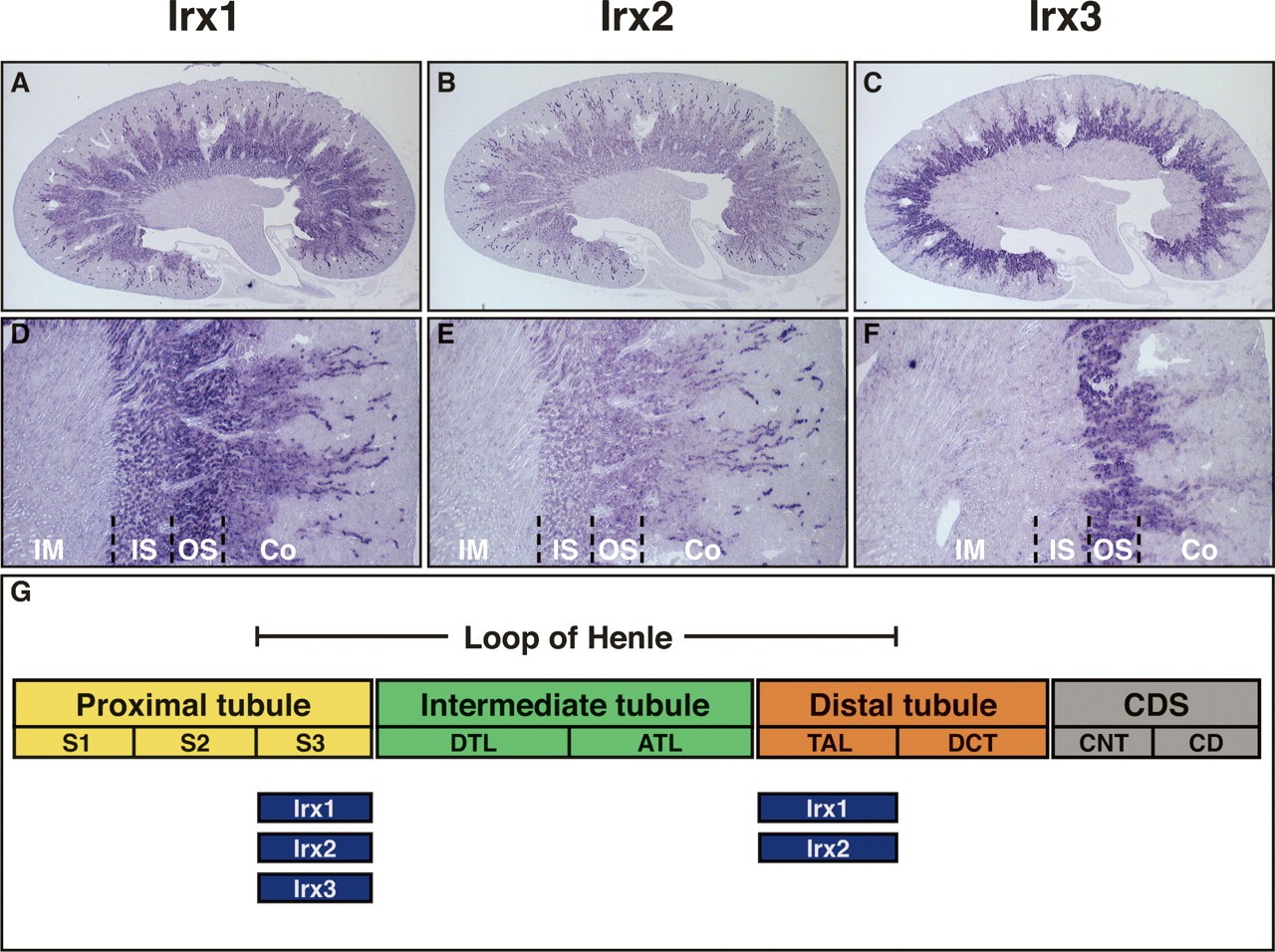 Figure 4. Irx gene expression is confined to distinct segments of Henleâs loop in the adult metanephric kidney. (AâF) Expression of Irx genes in the adult kidney. In situ hybridizations were performed on paraffin sections. Whole sagittal sections (AâC) and magnifications (DâF) are shown to illustrate Irx gene expression in detail. (Co) Cortex; (OS) outer stripe of outer medulla; (IS) inner stripe of the outer medulla; (IM) inner medulla. (A,B,D,E) Irx1 and Irx2 transcripts are detected in S3 and TAL. (C,F) Irx3 transcripts are confined to S3 only. (G) Summary of Irx gene expression in the adult metanephric kidney. The segmental organization of the adult metanephric nephron is shown schematically. The expression domains of each Irx gene are indicated below the scheme. (ATL) Ascending thin limb; (CD) collecting duct; (CDS) collecting duct system; (CNT) connecting tubule; (DCT) distal convoluted tubule; (DTL) descending thin limb; (S1, S2, S3) segments of the proximal tubule; (TAL) thick ascending limb. |