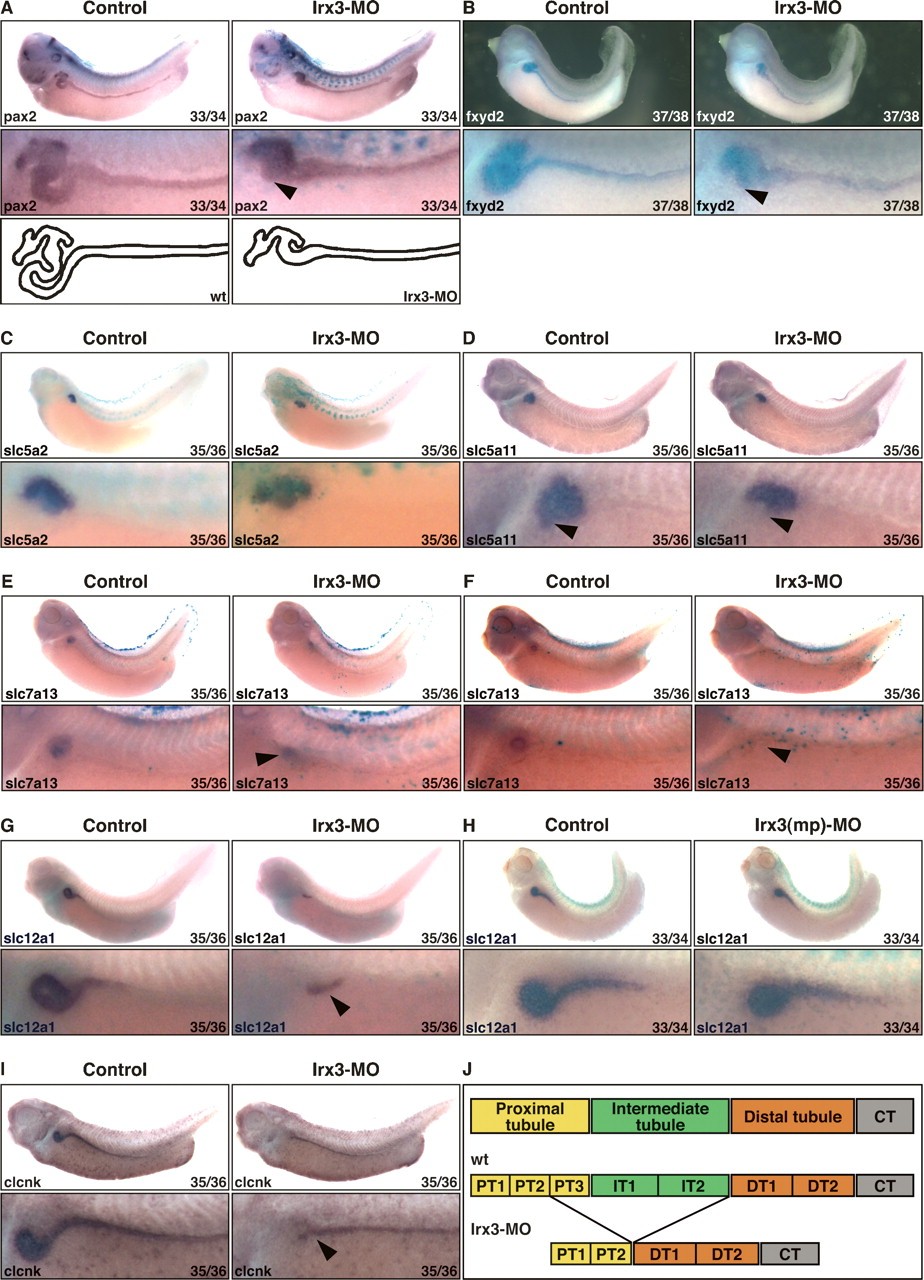Figure 6. Irx3 is required for intermediate tubule formation in the Xenopus pronephric kidney. (AâI) Irx3-MO (5 ng; AâG, I) or Irx3(mp)-MO (5 ng; H) and mRNA (0.25 ng) for the lineage tracer nuclear β-galactosidase were coinjected into single V2 blastomeres of eight-cell-stage embryos. Injected embryos were raised to the embryonic stage indicated, fixed, and processed for β-gal activity. Expression of marker genes was subsequently visualized by in situ hybridization. Control and injected sides are shown as lateral views with accompanying enlargements of the pronephric kidney region. (A,B) Irx3 knockdown affects pronephric morphogenesis. Arrowheads indicate the central looped region that is abnormal. Schematic representations show the outline of the nephron in normal and Irx3-MO-injected embryos. (C) Irx3 knockdown does not affect PT1 and PT2. (DâF) Irx3 knockdown causes a loss of the proximal tubule segment PT3. The arrowhead indicates the position of the PT3 segment. Examples of strong reduction (E) and complete loss (F) of slc7a13 expression are shown. (GâI) Irx3 knockdown causes loss of IT1 and IT2 but not of DT1. Arrowheads indicate the location of DT1. Note that slc12a1 expression remains unaffected in the presence of the control Irx3(mp)-MO (H). (J) Summary illustrating the nephron segmentation defects seen in irx3 knockdown embryos. See Figure 1C for the nomenclature of pronephric nephron segments and their abbreviations. |