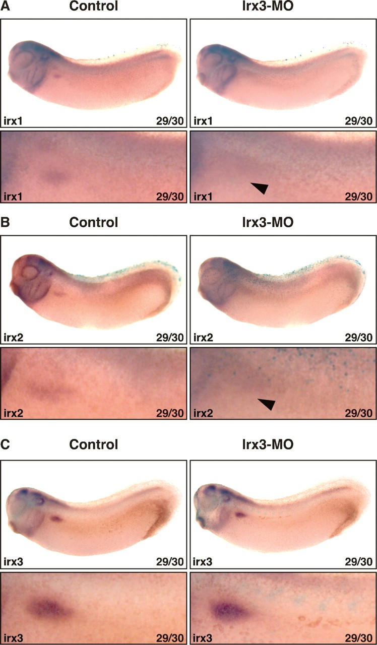 Figure 7. Pronephric expression of irx1 and irx2 but not irx3 requires irx3 gene function. Irx3-MO (5 ng) and mRNA (0.25 ng) for the lineage tracer nuclear β-galactosidase were coinjected into single V2 blastomeres of eight-cell-stage embryos. Injected embryos were raised to the embryonic stage indicated, fixed, and processed for β-gal activity. Expression of marker genes was subsequently visualized by in situ hybridization. Control and injected sides are shown as lateral views with accompanying enlargements of the pronephric kidney region. (A,B) Irx3 knockdown disrupts irx1 and irx2 expression in the developing pronephric kidney. Arrowheads indicate the pronephric area devoid of irx1 (A) and irx2 (B) expression. (C) Irx3 knockdown does not affect irx3 expression. |