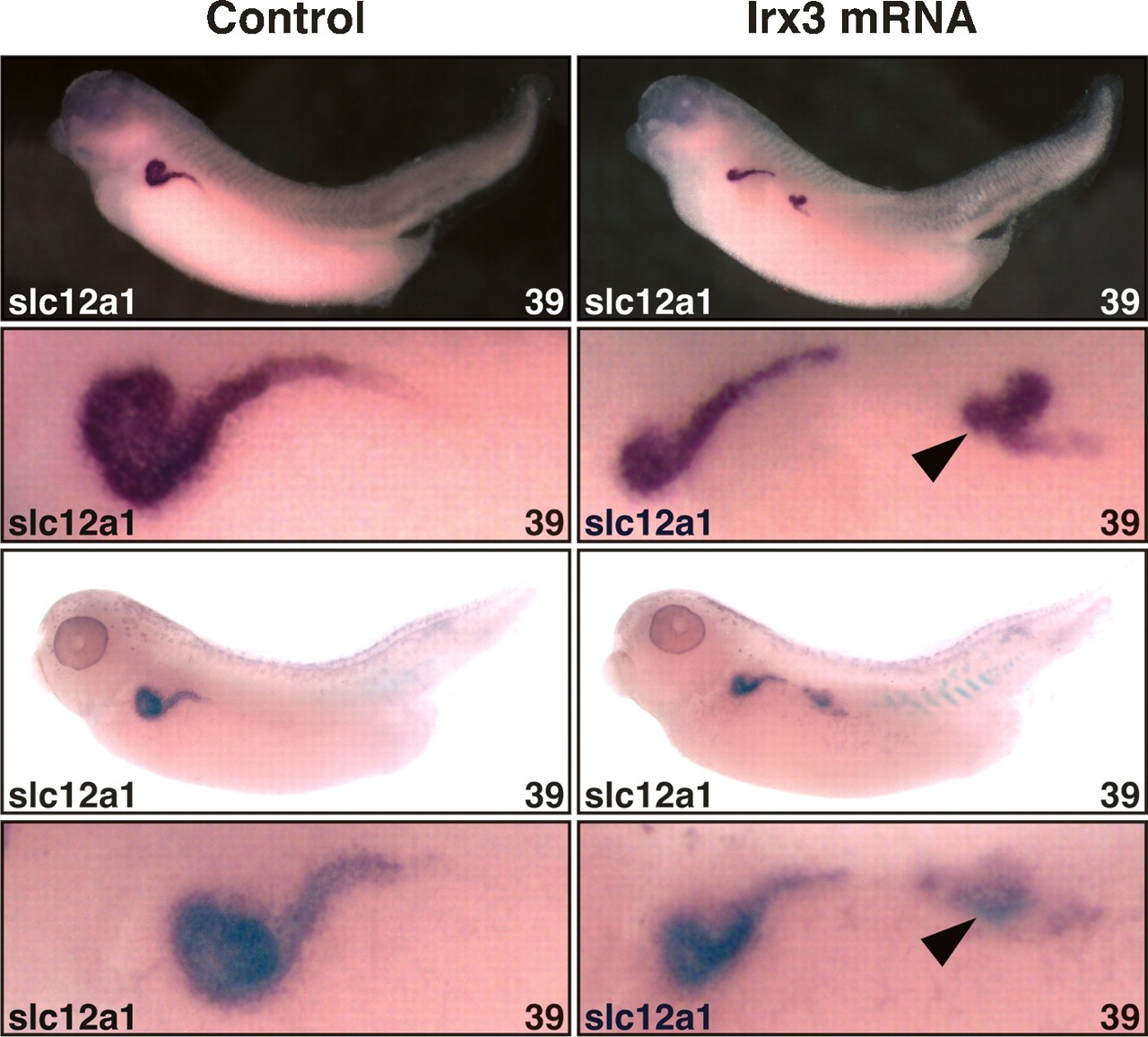 Figure 8. Irx3 is sufficient for intermediate tubule formation in the Xenopus pronephric kidney. Single V2 blastomeres of eight-cell-stage embryos were injected with irx3 mRNA (0.15 ng). Injected embryos were raised to the embryonic stage indicated, fixed, and processed for β-gal activity. Expression of the slc12a1 marker gene was subsequently visualized by in situ hybridization. Lateral views of control and injected sides of two representative embryos displaying the gain-of-function phenotype are shown with accompanying enlargements of the pronephric kidney region. The arrowheads indicate the ectopic intermediate tubule tissues expressing slc12a1. |