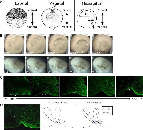 previous termXenopusnext term laevis bottle cell formation. (A) Embryo orientation. Lateral illustration (left panel, Stage 8) and vegetal illustration (middle, Stage 10) from Nieuwkoop and Faber (1994). Dotted line through vegetal view shows the mid-sagittal plane. Abbreviations: DMZ, dorsal marginal zone; BC, blastocoel; Br.c, Brachet's cleft; BP, blastopore. (B) Time-lapse images of bottle cell formation in a whole embryo (top) and in a dorsalateral marginal zone explant. Time elapsed (in minutes) noted in the bottom left-hand corner of each panel. Small arrows point to sites of bottle cell formation. Movies of this embryo and explant can be found in the Supplementary materials. (C) Confocal midsagittal images of DMZs stained with α-tubulin antibody from late stage 9 (left) to stage 10.25 (right) showing progression of bottle cell formation (small arrows) and blastopore groove formation. In this and all DMZ midsagittal views, embryos are oriented with vegetal to the left and apical side down. (D) Measuring apical constriction. Left panel shows a confocal image of a midsagittal section of a DMZ stained with α-tubulin antibody. Asterisks indicate cells undergoing apical constriction, which are illustrated in middle and right panels. Blastopore depth (d), indicated by the length of the arrow in the middle panel. The right panel illustrates the apical index (AI), which is the cell length (l) divided by the apical width (aw). Scale bar = 50 μm.