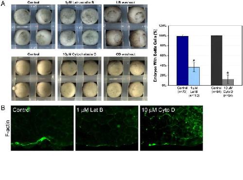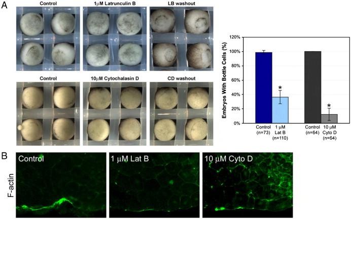 F-actin is required for bottle cell formation. (A) Actin inhibitors latrunculin B (top) and cytochalasin D (bottom) reversibly prevent bottle cell formation. Control embryos were in 1% DMSO. Bar graph shows percent of embryos making bottle cells in the presence of DMSO control or inhibitor. n, number of embryos. Error bars = 2S.E. (B) F-actin distribution as indicated by Oregon green-conjugated phalloidin in control, latrunculin B, and cytochalasin D-treated embryos.