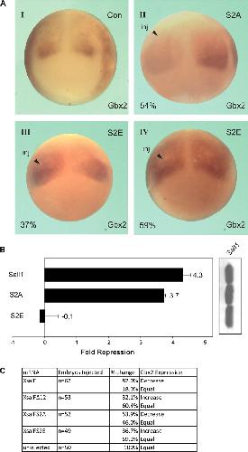 Phosphorylation of the SRM disrupts Sall1-mediated repression of Gbx2 in vivo. A, the serine point mutants, S2A and S2E, were created in the context of XsalF and expressed as capped RNA for injection into eight-cell Xenopus embryos. The injections and in situ hybridization experiments were performed exactly as described in the legend for Fig. 1. The microinjection manipulations revealed that the S2A mutant does not disrupt XsalF-mediated repression, revealing either a decrease in Gbx2 expression (A, panel II, 53.85%, n = 52) or equal expression (data not shown). In contrast, the phosphomimetic mutant, S2E, reveals a result similar to XsalFΔ12 where disruption of NuRD recruitment results in a failure to suppress Gbx2 expression. The S2E embryos showed no change (A, panel IV, 59.18%, n = 49) or unilateral expansion (A, panel III, 36.73%, n = 49) in Gbx2 expression on the injected side. Control embryos were not injected (A, panel I, con). Arrows indicate site of injection. B, COS-1 cells were transfected with the indicated Flu-Sall1 fusion proteins and the Gbx2 (–1620 bp to –660 bp) luciferase reporter. The -fold repression was calculated as luciferase activity relative to Flu alone and is expressed as the mean ± S.D. for triplicate transfections of three independent experiments. C, table showing total number of injected Xenopus embryos for each mRNA and the effects on Gbx2 expression. The representative images are displayed in Figs. 1 and 8. Wild-type XsalF and S2A were both capable of repressing Gbx2 expression. In contrast, XsalFΔ12- and S2E-injected embryos showed a loss of repression or increased levels of Gbx2 expression. |