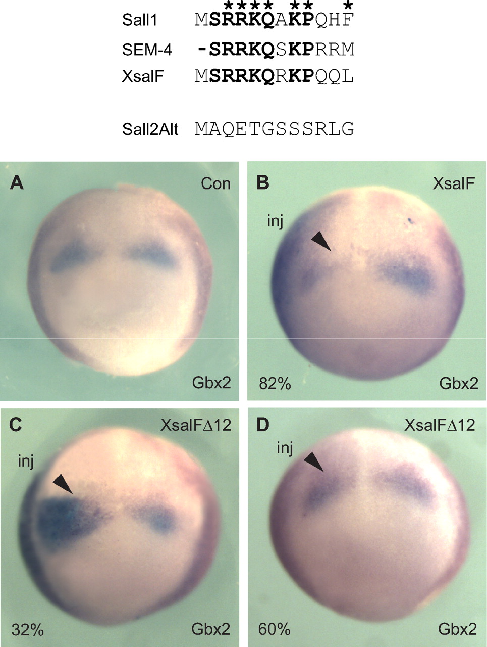 Expression of Gbx2 depends on NuRD recruitment. Alignment of the extreme N termini of mammalian Sall family members 1–4, and the Sal orthologs, Sem-4 (C. elegans) and XsalF (Xenopus), reveals the sequence conservation within the first 12 amino acids of the N terminus. The conserved residues are shown in boldface type. *, denotes the critical residues in Sall1 that are required for repression and NuRD recruitment (10). Although amino acid 12 is not conserved, it is always hydrophobic and is required for Sall1-mediated repression. An alternative splice form of Sall2 (Sall2Alt) encodes a different 5′ exon, resulting in a dissimilar N terminus. Sequences were obtained from the NCBI data base and have the following accession numbers: M. musculus, NP_056587 Sall1; C. elegans Sem-4, AABO3333; M. musculus Sall2Alt, AJ007396; and X. laevis XsalF, AA579483. 400 pg of capped RNA (XsalF or XsalFΔ12) was injected into two left animal blastomeres. Co-injection of β-galactosidase verified the site of injection, and embryos were harvested at the neurula stage (A–D). Whole mount in situ hybridization for Gbx2 revealed reduced expression in the XsalF-injected side (left) compared with the uninjected (right) side in 82% of embryos (B, 82%). Deletion of the SRM (XsalFΔ12) abolished this repression (D, 60%) or resulted in increased Gbx2 expression (C, 32%). 6% could not be scored. Control embryos were not injected (A, con). Arrows indicate the site of injection. |