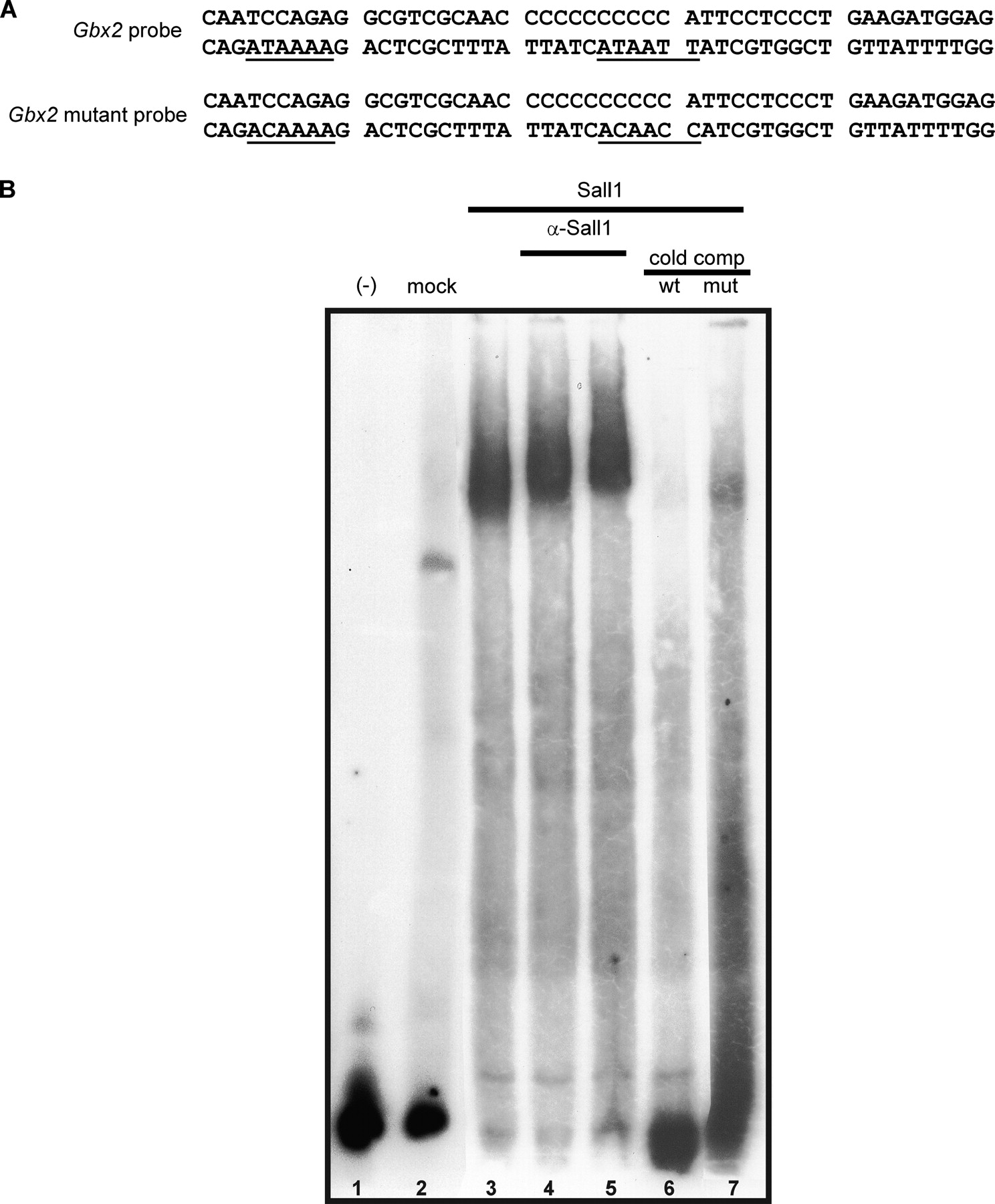 Sall1 requires DNA binding sites, ATAAAA and ATAATT, for interaction with the Gbx2 locus. Top, Gbx2 wild-type and mutant probes used in EMSAs. The Gbx2 mutant probe contains point mutations in the Sall1 DNA binding sites which are underlined. Bottom, EMSA showing Sall1 binding to the Gbx2 probe. Lane 1 contained the designated wild-type Gbx2 probe alone, and lane 2 (mock) indicates the same probe with nuclear extract expressing empty Flu expression plasmid (pcDNA3) as a control. Lanes 3–7 indicate nuclear extract prepared from COS-1 cells transfected with full-length Flu-Sall1. Supershift assays were performed using affinity-purified antibodies that recognize different epitopes of Sall1 (lanes 4 and 5), and a cold competition assay was performed with 10-fold molar excess Gbx2 wild-type probe (lane 6) or 10-fold molar excess of Gbx2 mutant probe (lane 7). |