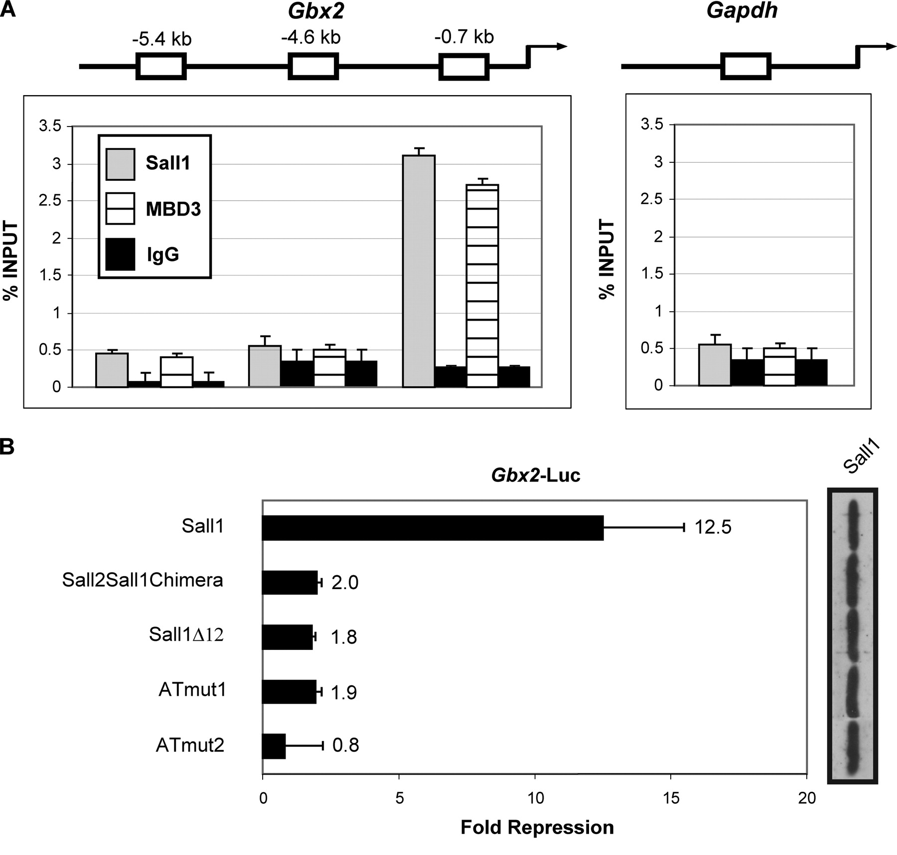 Sall1 and NuRD directly bind Gbx2 in vivo to mediate repression. ChIP assays were performed on P19 cells with anti-Sall1 (gray bars), anti-MBD3 (horizontal lines), or a nonspecific IgG control antibody (black bars). A, immunoprecipitated DNA was analyzed by qPCR amplification. ChIP analysis revealed Sall1 and MBD3 binding to a Gbx2 region at –0.7 kb; the –4.6 kb and –5.4 kb regions of Gbx2 and Gapdh served as negative controls. The qRT-PCR results represent ±S.D. derived from three independent experiments. B, COS-1 cells were transfected with a pGL3-promoter reporter containing a 960-bp promoter region of Gbx2 (–1620 bp to –660 bp) and the indicated Flu-epitope tagged Sall1 constructs consisting of wild-type Sall1, Sall2Sall1 chimera where the first 12 amino acids are altered, and a Sall1 construct (Δ12) where the first 12 amino acids are deleted. COS-1 cells were also transfected with mutant pGL3-promoter reporters and Flu-Sall1. ATmut1 contains a mutation in the first AT recognition sequence (ATAAAA to ACAAAA), and ATmut2 contains a mutation in the second AT recognition sequence (ATAATT to ACAACC). The -fold repression was calculated by dividing the normalized luciferase activity of COS-1 cells expressing Flu alone by the activity of the Sall1 expression plasmids and is expressed as the mean ± S.D. for triplicate transfections of three independent experiments. Sall1 immunoblot reveals equal expression of each Sall1-flu fusion protein for each transfection condition. |