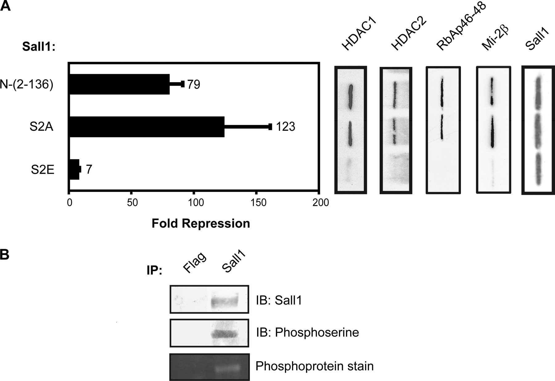 S2E phosphomimetic mutation of the Sall1 repression motif prevents repression and NuRD recruitment. In A: Left panel, COS-1 cells were transfected with the indicated GAL4DB-Sall1 fusion proteins and a reporter with luciferase under control of the SV40 promoter and 5 upstream GAL4 binding sites. The -fold repression was calculated as luciferase activity relative to GAL4DB alone and is expressed as the mean ± S.D. for triplicate transfections of three independent experiments. Right panel, COS-1 cells were also transfected with GST fusions corresponding to the GAL4 fusions of Sall1. GST pulldown of GST Sall1N-(2–136) or GST-Sall1N-(2–136) with S2A and S2E point mutations were analyzed for association with selected NuRD components by Western blot using antibodies specific to HDAC1, HDAC2, RbAp46, RbAp48, and Mi-2β. B, P19 cell extracts were immunoprecipitated (IP) with a control FLAG or monoclonal Sall1 antibody and separated by SDS-PAGE. The gel was then either transferred and probed with a polyclonal Sall1 or phosphospecific antibody or stained with Pro-Q Diamond Phosphoprotein in Gel Stain to reveal that Sall1 exists as a serine phosphoprotein in vivo. |