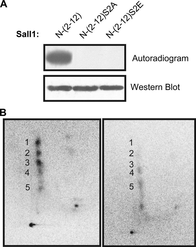 Phosphorylation of Sall1 at serine 2. A, COS-1 cells were transfected with GST-Sall1-(2–12) or GST-Sall1-(2–12) S2A or S2E point mutants. The cells were radiolabeled with [32P]orthophosphate for 4 h prior to harvesting the lysates. GST-Sall1 constructs were complexed to glutathione, separated by SDS-PAGE, and analyzed by autoradiography to localize phosphorylation to Ser-2 of the SRM. B, phosphopeptide mapping of Sall1. COS-1 cells were radiolabeled with [32P]orthophosphate after transient transfection with Flu-tagged Sall1-(2–1322) or Flu-tagged Sall1S2A-(2–1322). Purified 32P-labeled Sall1 was digested with trypsin, and the resulting phosphopeptides were separated in two dimensions: by electrophoresis and by ascending chromatography. The autoradiograms of the resulting phosphopeptide maps are shown. The left panel shows a phosphopeptide map of full-length Flu-Sall1-(2–1322) revealing five phosphopeptides (1–5). The right panel shows that point mutagenesis of Ser-2 to alanine eliminates the phosphorylation of peptides 1–3 confirming this site as a phosphorylation site of Sall1. This figure is representative of three independent experiments. |