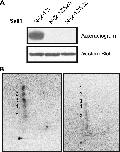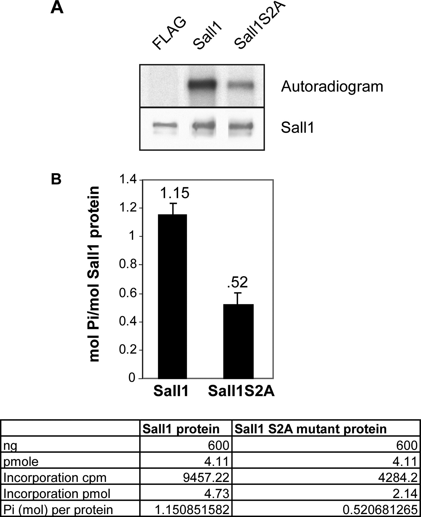 Mutation of serine 2 of the SRM disrupts the incorporation of 32P. A, COS-1 cells were radiolabeled with [32P]orthophosphate after transient transfection with Flu-tagged Sall1-(2–1322) or Flu-tagged Sall1S2A-(2–1322). An anti-FLAG control immunoprecipitation was performed on a cell lysate expressing Flu-tagged Sall1-(2–1322). Purified 32P-labeled Sall1 and S2A were separated on 5% SDS-PAGE and analyzed by autoradiography. B, after the products were run on 5% SDS-PAGE and transferred to 3MM Whatman paper, the phosphorylated Sall1 and S2A bands were excised, and radioactivity was measured by using a scintillation counter. The specific activity of [γ-32P]ATP in the reaction mixtures was 2000 cpm/pmol ATP. The amounts of Sall1 protein and incorporation of 32P into Sall1 and S2A are included in the table. |