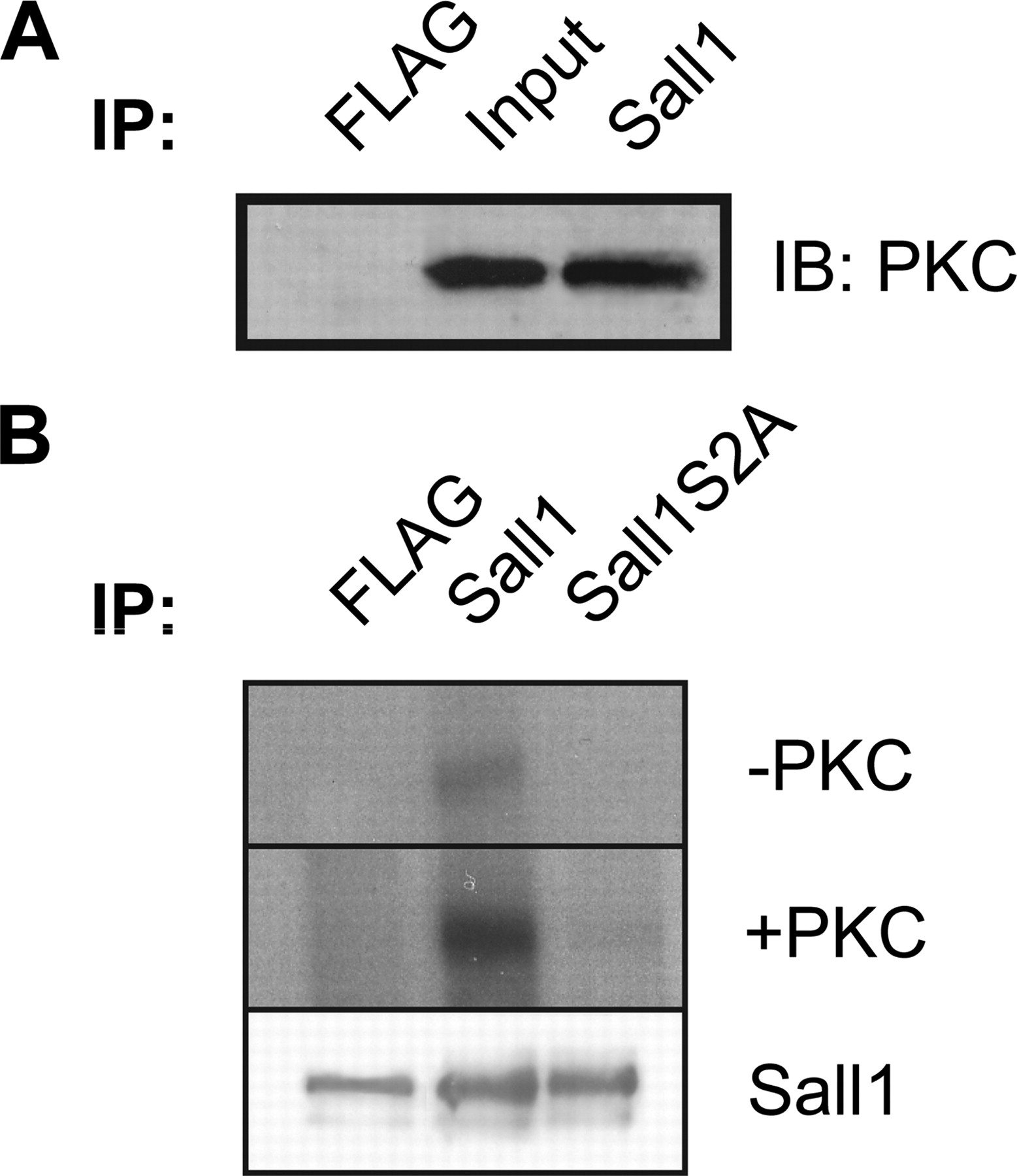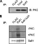 Sall1 is phosphorylated by PKC. A, P19 cell extracts were immunoprecipitated (IP) with a control FLAG or monoclonal Sall1 antibody followed by Western blotting with an antibody to PKC. B, purified Sall-Flu-(2–1322) and Sall1S2A-Flu-(2–1322) were expressed in COS-1 cells and immunopurified. An anti-FLAG control immunoprecipitation was performed on a cell lysate expressing Sall-Flu-(2–1322). The purified proteins were then incubated in the absence or presence of purified PKC for 5 min at 30 °C, followed by the addition of 1 μl of 1 mM dATP for 30 min at 30 °C. The products were then run on 5% SDS-PAGE and analyzed by autoradiogram. |