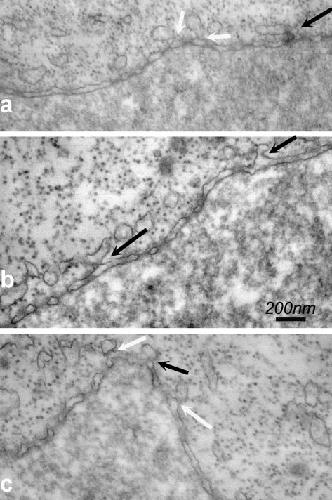Fig. 4. Thin section TEM of NE with cytoplasmic membranes attached. Membranes may be continuous with the ONM (black arrows) or attached but apparently not continuous (white arrows).