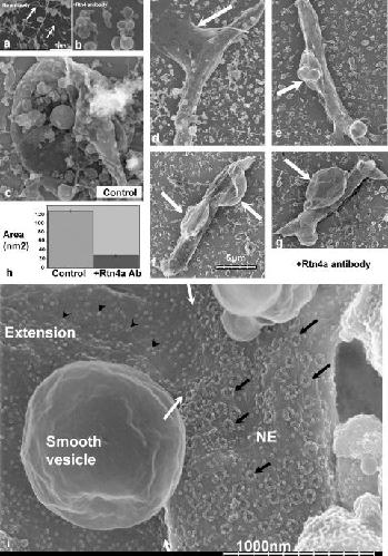 Fig. 7. Rtn4a antibody perturbs NE growth in Xenopus egg extract. The antibody prevents the usual formation of ER tubules (a, arrows), instead forming large vesicles (b). In control nuclear assembly reactions (c) nuclei are large and roughly round, whereas in the presence of the antibody they remain sperm shaped with large membrane extensions (arrows) (d–g). (h) Nuclear growth is significantly retarded by the Rtn4a antibody as shown by quantification of the two-dimensional area of nuclei observed by feiSEM. (i) High magnification image of nucleus assembled in the presence of Rtn4a antibody, showing NPCs (black arrows) assembled on the sperm chromatin shaped region and the NPC-free ER-like extension with ribosomes (arrowheads). White arrows indicate the junction between the chromatin bound NE and the ER-like extension. Scale bar in (a) applies to (a and b). Scale bar in (f) applies to (c–g).