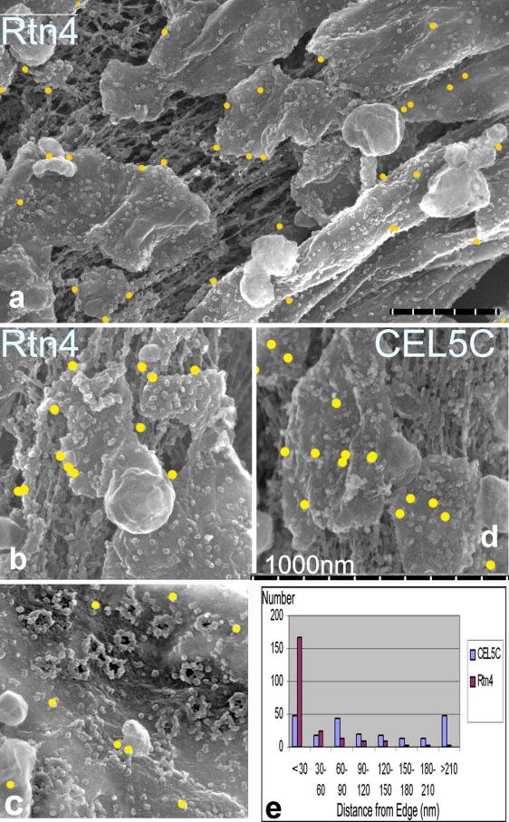 Fig. 6. Membranes flattening onto chromatin during the early (a, b and d) stages of NE assembly in Xenopus egg extracts and labelled with antibodies to Rtn4a (a–c) or ribophorin (antibody CEL5C), marked by circles (d). (c) Fully assembled NE labelled for Rtn4a. (d) Quantification of gold labels for the two antibodies plotted as a distance from the edge. Scale bar in (d) refers to (b–d).