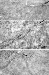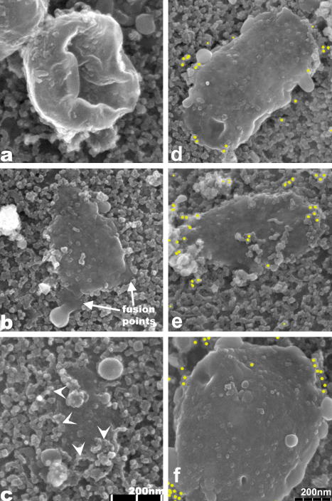 Fig. 3. Flattened membranes at the ONM of stage III oocyte. (a–c) Attached membranes with different inferred degrees of flattening: (a) is attached but not flattened; (b) is flattened with a few apparent points of fusion (arrows) and (c) is more integrated in the ONM and NPCs (arrowheads) are present around the edges (d–f) Immuno-gold labelling of Rtn4a in flattened membranes showing edge position of Rtn4a (circles). Scale bar in (c) refers to (a–c), scale bar in (f) refers to (d–f).