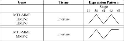 Figure 2. Patterns of MMP and TIMP RNA Levels Seen during X. laevis Intestine Metamorphosis Derived From RT-PCR Data.Levels of RNA found during intestine metamorphosis demonstrated that MT1-MMP, TIMP-2 and TIMP-3 shared similar RNA expression patterns, with peaks present at stages 58 and63. MT3-MMP and MMP-2 RNA expression patterns in the intestine did mirror each other, but were not similar to the three other genes. Changes in RNA levels are not quantitative, but instead illustrate patterns of expression.