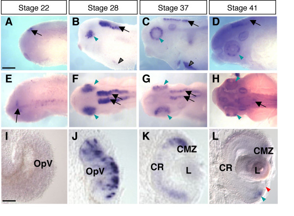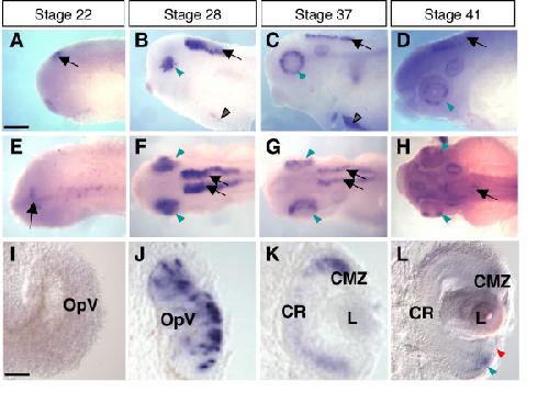 Figure 1. Ptf1a is expressed in a subpopulation of retinal precursors. Lateral (A-D) or dorsal (E-H) views of Xenopus embryos after Ptf1a whole-mount in situ hybridization at the indicated developmental stages. (A, E) Ptf1a-positive cells are detected in the presumptive hindbrain (arrow) at stage 22. (B-D, F-H) At later tailbud stages, Ptf1a transcripts are detected in the retina (green arrowhead), the pancreas (black arrowhead) and the hindbrain (arrow). (I-L) As shown on retinal sections, Ptf1a starts to be expressed at late optic vesicle stages (I versus J), in a subpopulation of retinoblasts (spotty expression pattern in J). (K, L) Its expression progressively vanishes from the central retina as differentiation proceeds and is finally restricted to the CMZ (green arrowhead), although excluded from the stem cell containing region (red arrowhead). OpV: optic vesicle; CMZ: ciliary marginal zone; CR: central retina; L: lens. Scale Bars represents 300 μm (A-H) or 50 μm (I-L).