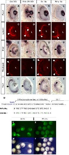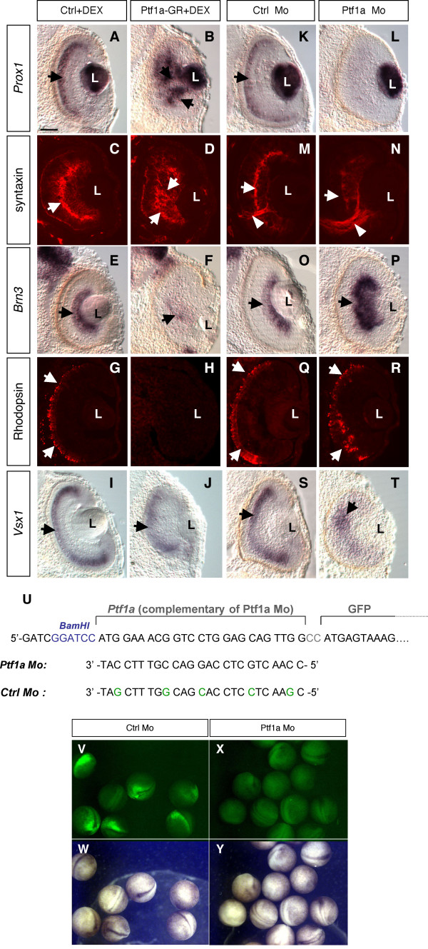 Figure 2. Ptf1a is required for proper amacrine and horizontal cell genesis. (A-T) In situ hybridization (A-B, E-F, I-J, K-L, O-P, S-T) or immunofluorescence (C-D, G-H, M-N, Q-R) analysis of cell-type specific marker expression in stage 39/40 retinas, following Ptf1a-GR or Ptf1a Mo injection in two cell stage embryos. (A-J) Prox1 (horizontal marker, arrows in A and B) and syntaxin (optic nerve and inner plexiform layer marker, arrows in C and D) expressions are expanded in the central retina following Ptf1a overexpression. In contrast, both Brn3 (ganglion cell marker, arrows in E and F) and rhodopsin (photoreceptor marker, arrows in G, H) display highly diminished expression. Expression of Vsx1 (bipolar marker, arrows in I and J) does not show any clear decrease although significant disorganization is occasionnaly observed in severe phenotypes (not shown). (K-T) Compared to control ones, Ptf1a Mo injected retinas display virtual absence of Prox1 expression (arrows in K, L) and reduced syntaxin staining in the IPL (arrows in M and N). Note the increased size of the optic nerve in Ptf1a knocked down retinas (arrowheads in M and N) that is consistent with the increased expression of the ganglion cell marker Brn3 (arrows in O and P). Both rhodopsin (arrows in Q and R) and Vsx1 (arrows in S and T) appear normally expressed albeit with a disorganized expression pattern. Ctrl: control; L: lens. Scale Bar represents 50 μm. (U-Y) Test of Ptf1a Morpholino efficiency. In vivo GFP fluorescence was analysed following co-injection of either Ptf1a Mo or Ctrl Mo with a chimeric GFP construct fused downstream Ptf1a Mo complementary region. (U) Schematic representation of the construct and sequences of Morpholino oligonucleotides. (V-Y) GFP expression can be observed in Ctrl Mo injected neurulas, while it is efficiently inhibited in Ptf1a Mo injected ones.
