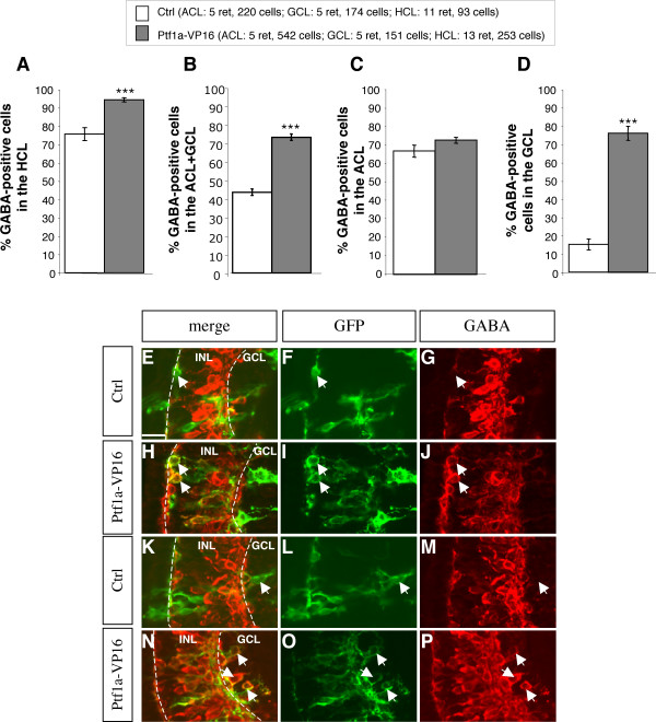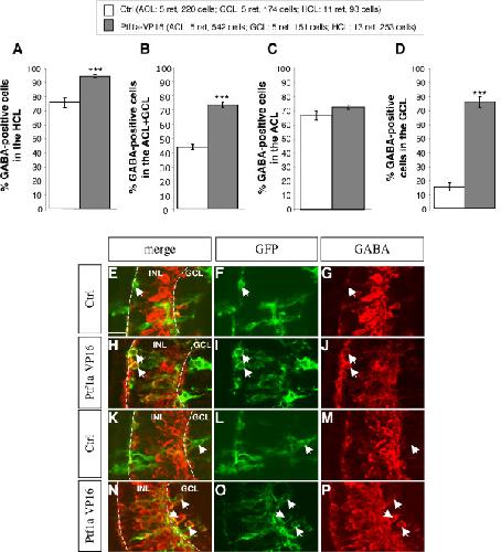 Figure 5. Ptf1a overexpression leads to enhanced proportions of GABAergic horizontal and displaced amacrine cells. Analysis of GABAergic cell proportions among GFP-positive horizontal and amacrine transfected cells in stage 40/41 retinas, following Ptf1a-VP16 lipofection. (A-D) Quantification of GABA-positive cells in the horizontal, amacrine and ganglion cell layers as indicated. Values are given as mean +/- s.e.m. p < 0.001 (***) (binomial test). (E-P) Typical sections of retinas lipofected with gap-GFP alone (E-G, K-M) or gap-GFP plus Ptf1a-VP16 (H-J, N-P), immunostained with an anti-GABA antibody. Arrows in E-G and K-M point to examples of gap-GFP-transfected GABA-negative horizontal and ganglion cell, respectively, in control retinas. Arrows in H-J and N-P point to GABA-positive horizontal and displaced amacrine cells, respectively, in gap-GFP plus Ptf1a-VP16 lipofected retinas. Ctrl: control; HCL: horizontal cell layer; ACL: amacrine cell layer; GCL: ganglion cell layer; INL: inner nuclear layer. Scale Bar represents 30 μm.