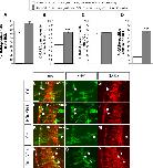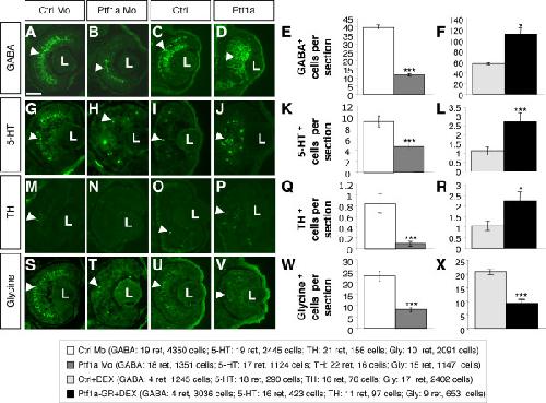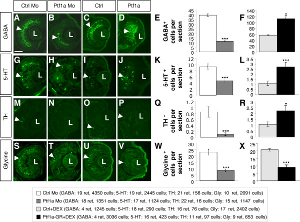 Figure 6. Ptf1a misexpression differentially affects amacrine cell subtypes genesis. Quantification of GABA-, serotonin (5-HT)-, tyrosine hydroxylase (TH)- and glycine-positive cells, following Ptf1a Mo (stage 40/41) or Ptf1a-GR (stage 39, except in O, P, R stage 41) injection in two cell stage embryos. (A-D, G-J, M-P, S-V) Typical sections of control, Ptf1a knocked-down or Ptf1a overexpressing retinas, immunostained for GABA, 5-HT, TH or glycine (arrows) as indicated. Graphs indicate the average numbers of GABA-, 5-TH-, TH- or glycine-positive cells per retinal section in each condition. Values are given as mean +/- s.e.m. p < 0.001 (***), p < 0.05 (*) (Student's t test). Ctrl: control; L: lens. Scale Bar represents 50 μm.